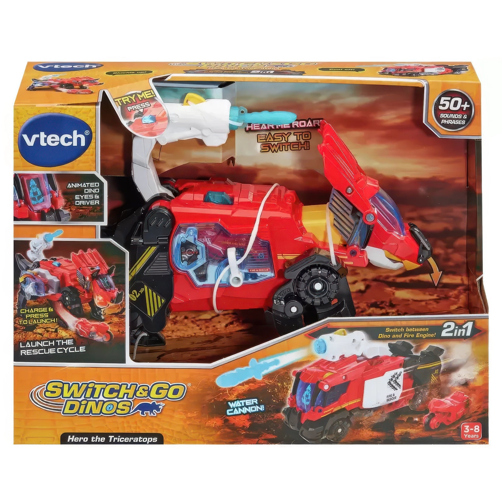 Unleash double the excitement with VTech Switch & Go Dinos Hero the Triceratops – a thrilling 2-in-1 toy that transforms from a powerful triceratops into a high-speed fire engine! Bursting with interactive lights, sound effects, and animated features, this dynamic toy invites children to embark on fiery rescue missions and dino adventures in one action-packed play experience.