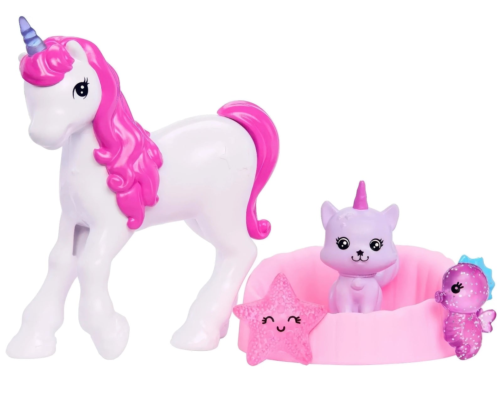 • There are also fantasy friends to find, like a mini unicorn, kitty, starfish, and seahorse! Included is a pet bed for sweet dreams.