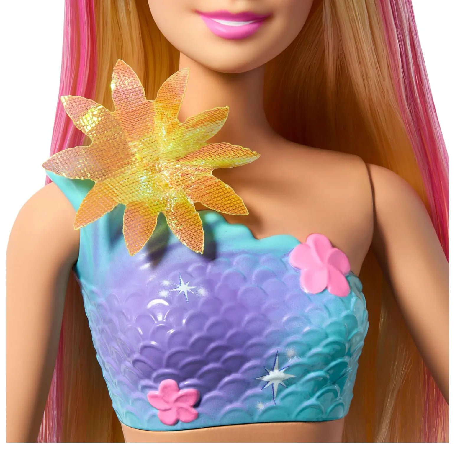 Blossom into fun with Barbie Flower Magic Mermaid doll! Slide the lever on her back to see flowers magically 'bloom' from her bodice to her fins, over and over again! Kids can play with these dolls on land and in water for a beautiful blossoming display under the sun or sea. With her iridescent flowers, ombre fins, and pearl headband accessory in her gorgeous long blonde hair with pink highlights, this Barbie mermaid doll is as enchanting as an undersea garden. Doll cannot stand or swim alone. Colours and decorations may vary.