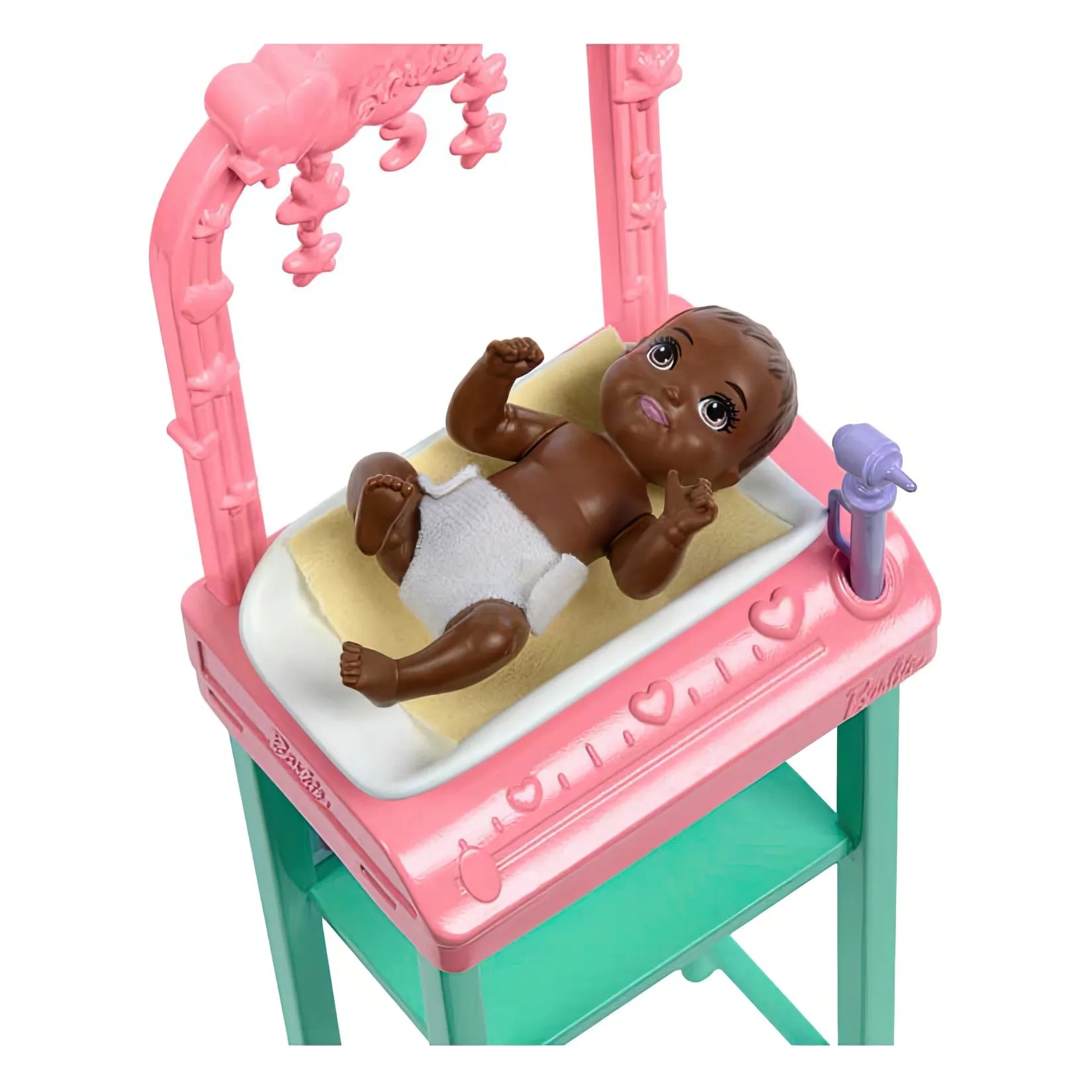 • Includes 1 Barbie® doll wearing a pink heart print top, pink pants, shoes, 1 baby with diaper, 1 stethoscope, 1 otoscope, 1 baby bottle, 1 examination table with an overhead mobile. Doll cannot stand alone. Colors and decorations may vary.
