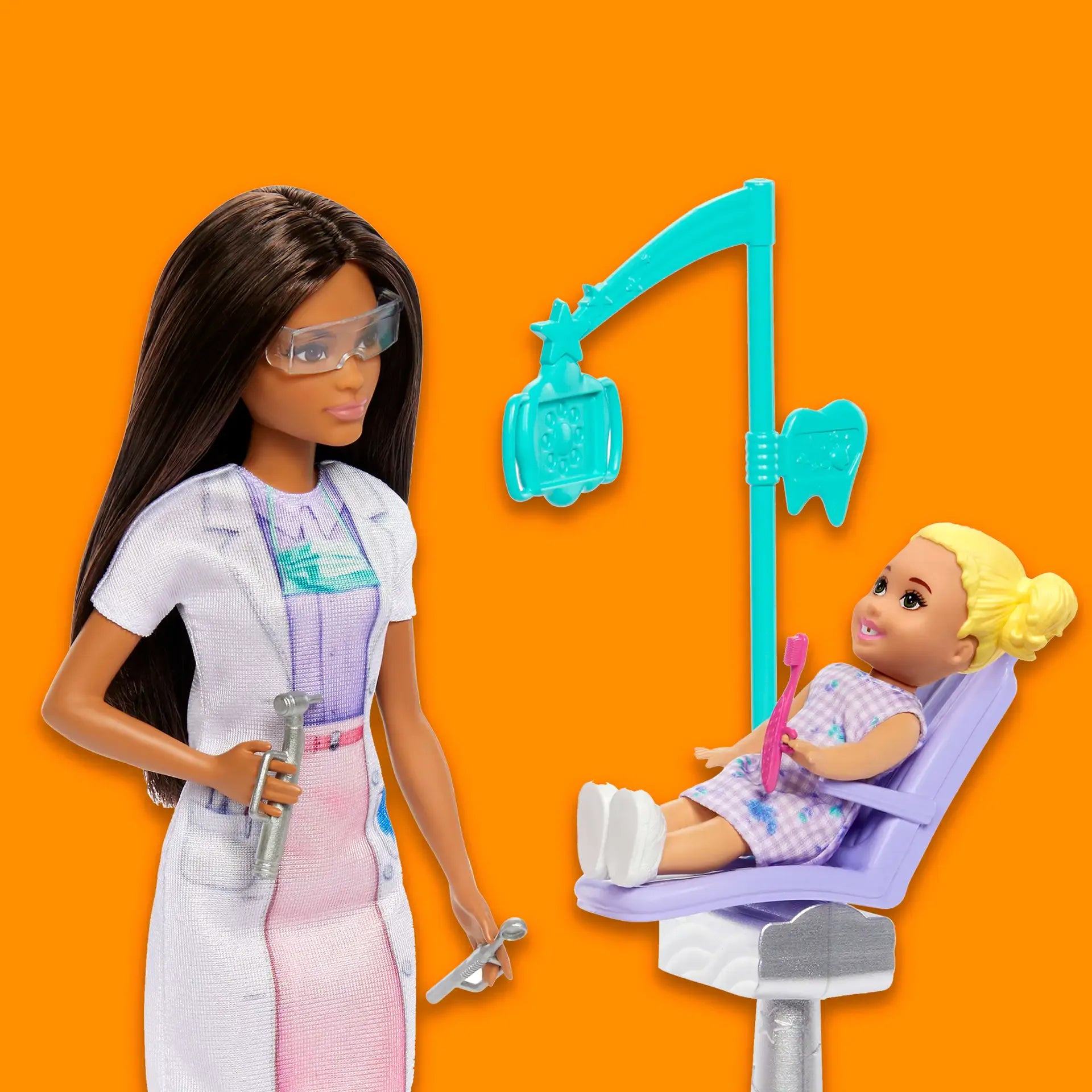 Kids can explore all kinds of career roles, including a Baby Doctor! This set includes a baby doctor environment including Barbie and her adorable baby doll patient! Barbie is wearing her pink heart print scrub set, ready to keep babies happy and healthy!