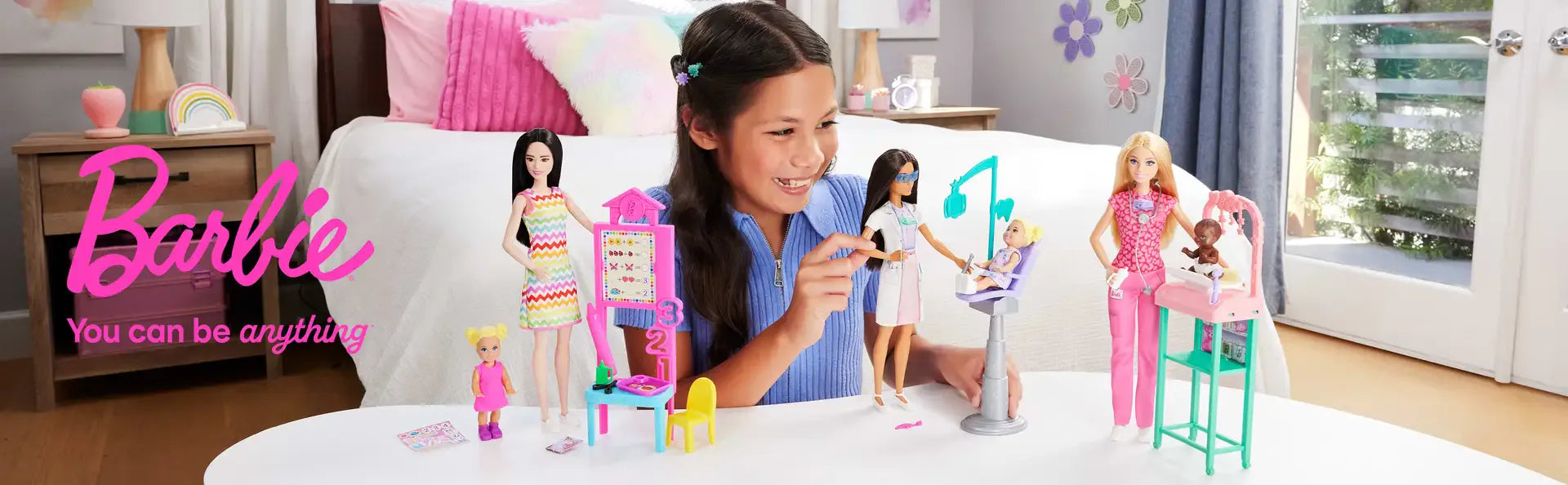 The set also includes her examination table with Stars overhead and a shelf underneath to hold all the accessories, like a baby bottle or Barbie's stethoscope. Imaginations can play out a world full of storytelling possibilities and career opportunities with this powerful doll, ready to inspire kids to be anything! Doll cannot stand alone. Colours and decorations may vary.