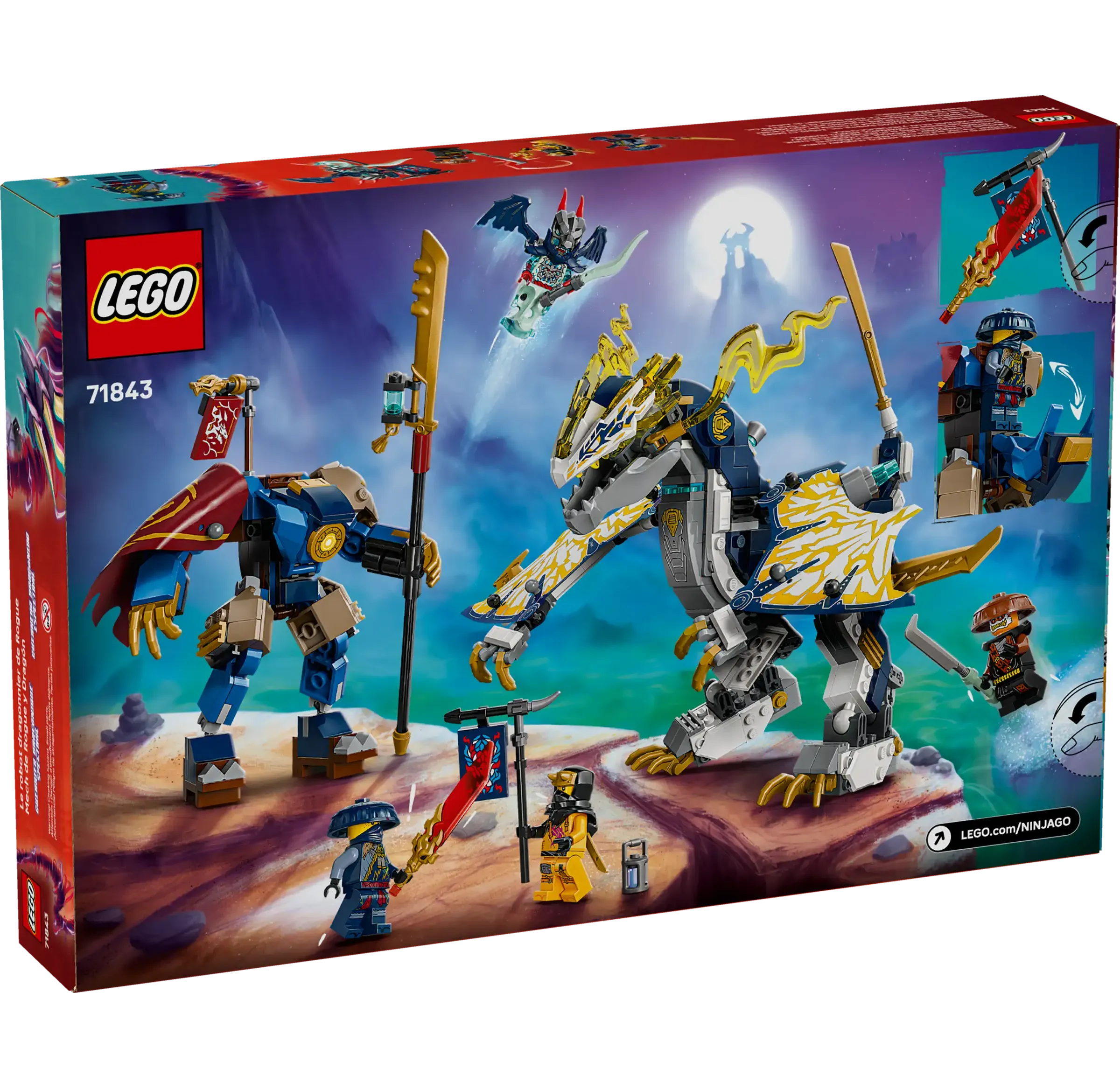 Rogue’s Mech Dragon Rider (71843) combo ninja toy lets boys and girls aged 8 plus enact tales from season 3 of the NINJAGO® Dragons Rising TV show. Kids can separately play with a mech toy and the first-ever NINJAGO robot dragon toy before combining them into the awesome Rogue’s Mech Dragon Rider.