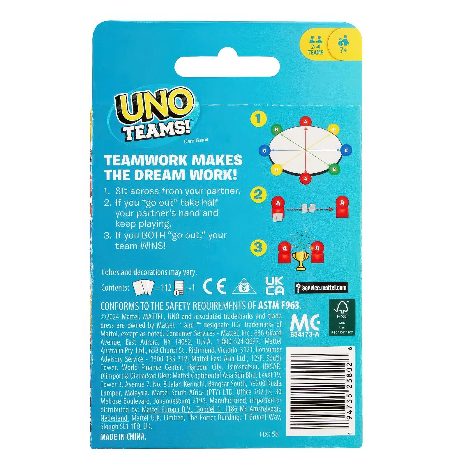UNO Teams is a new way to play the classic game! Players still match colour, number, and symbol, but instead of every-man-for-himself, they team up in pairs of two and play together to win. Special cards and rules help teammates work together, but both players must get rid of all the cards in their hands to win. And remember, when you (or your partner!) are down to your last card, don't forget to yell 'UNO!'