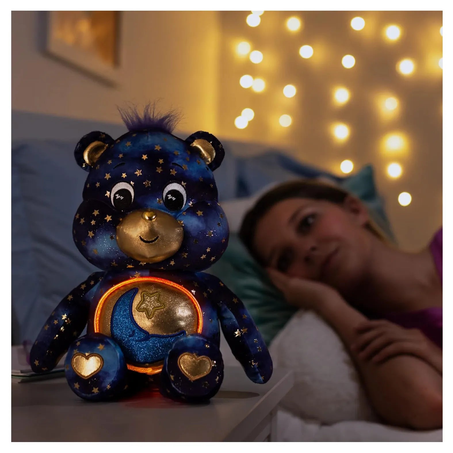 • LIGHT UP BELLY - Inspired by the night sky with golden stars and a light up belly, you'll feel safe knowing Bedtime Bear by your side.