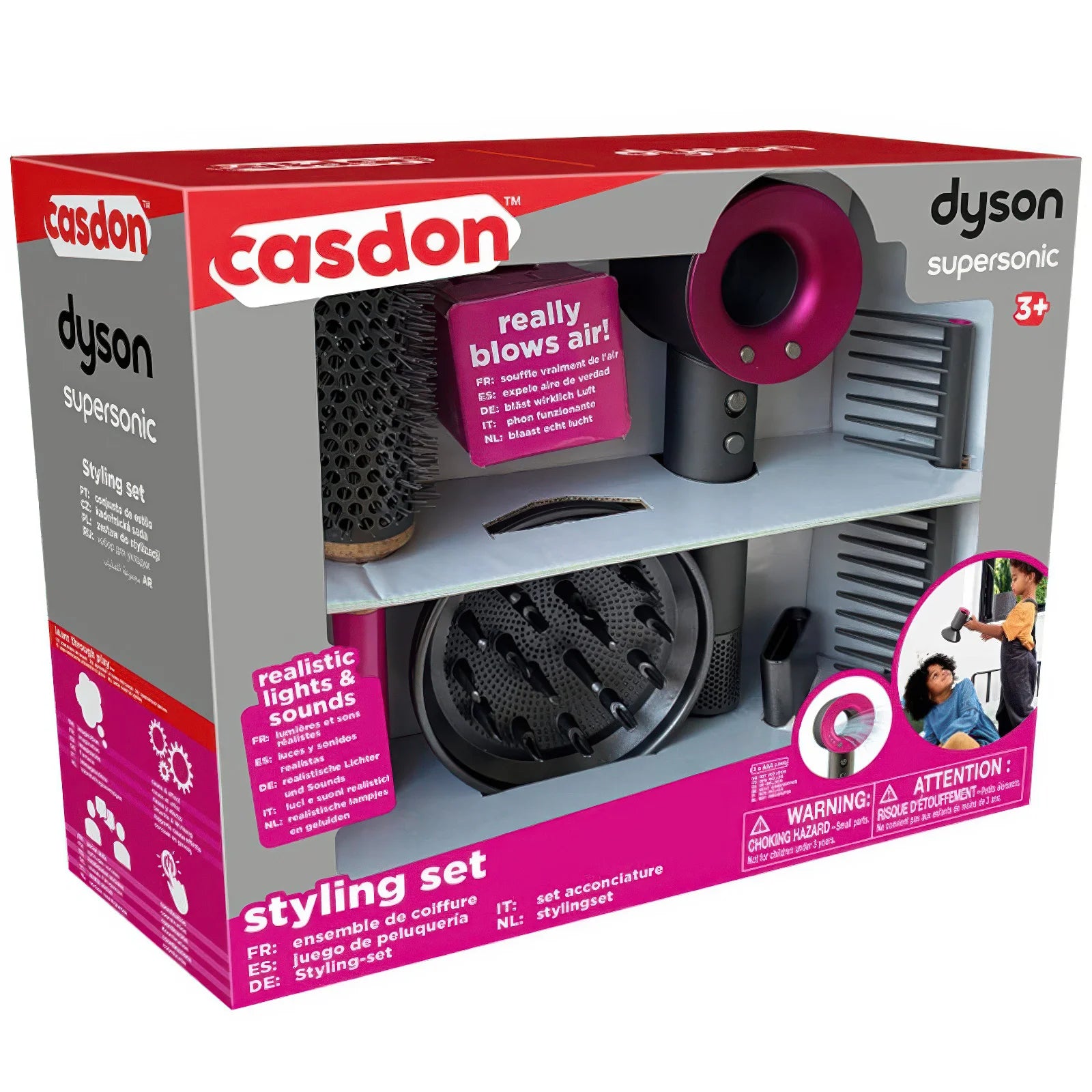 Whether getting ready for playtime with friends or setting up a salon, this toy Dyson Supersonic Styling Set will be sure to make life easier!