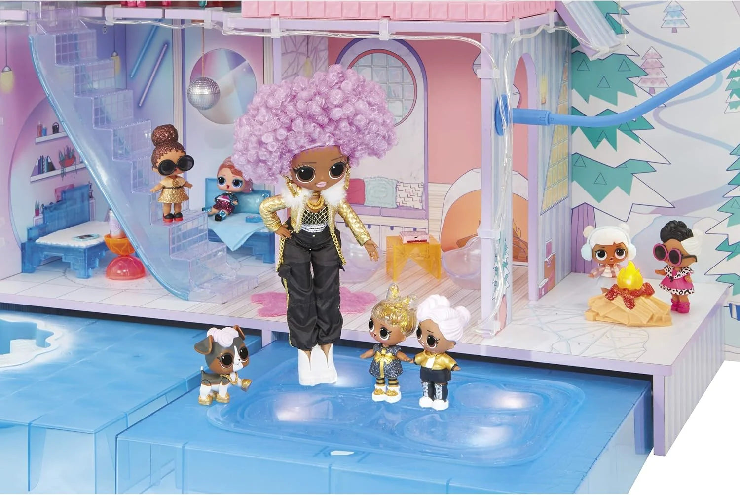 Made from wood, the L.O.L. Surprise Chalet has 3 stories and 6 rooms, and includes a light up ice skating rink, working ski lift, chimney that really snows, and it fits both L.O.L. Surprise and L.O.L. Surprise O.M.G. dolls. Use the included 15 ft. of lights to decorate the Chalet and make it glow. Freeze water on the real ice skating rink, so both your L.O.L. Surprise dolls and L.O.L.