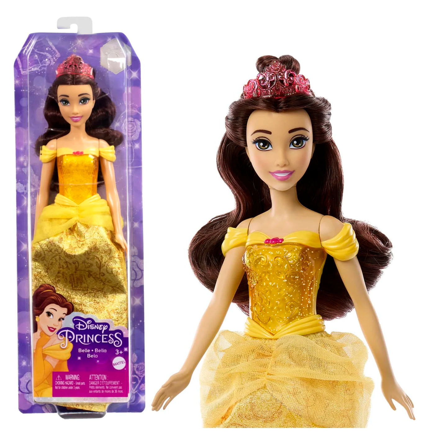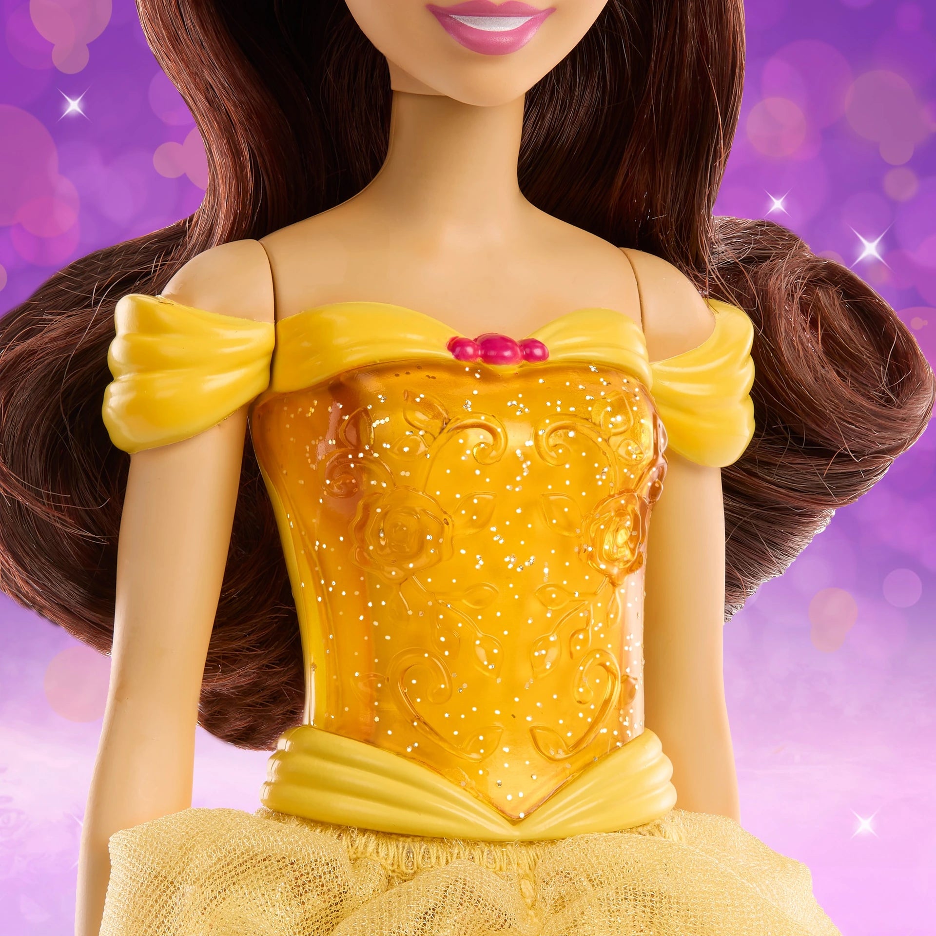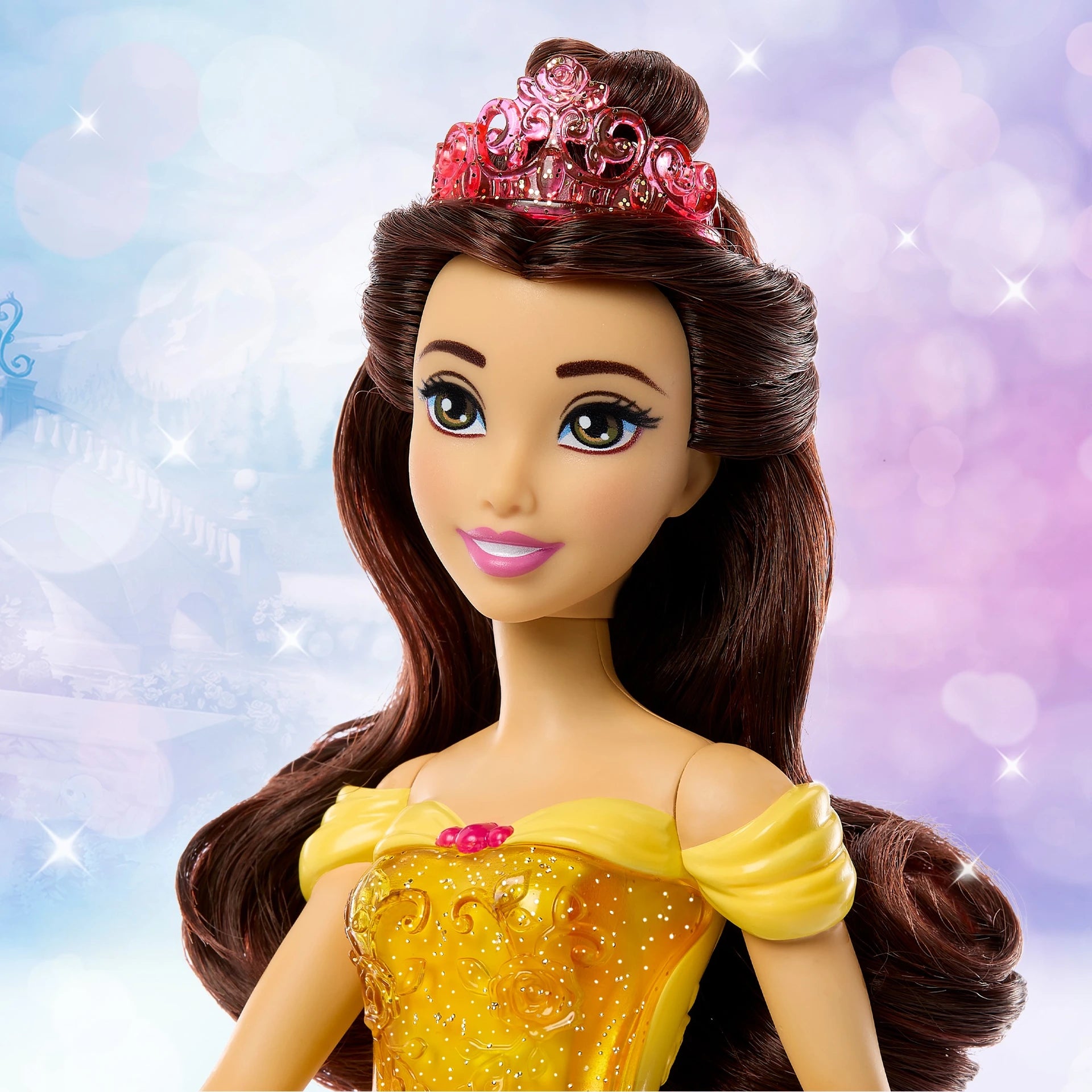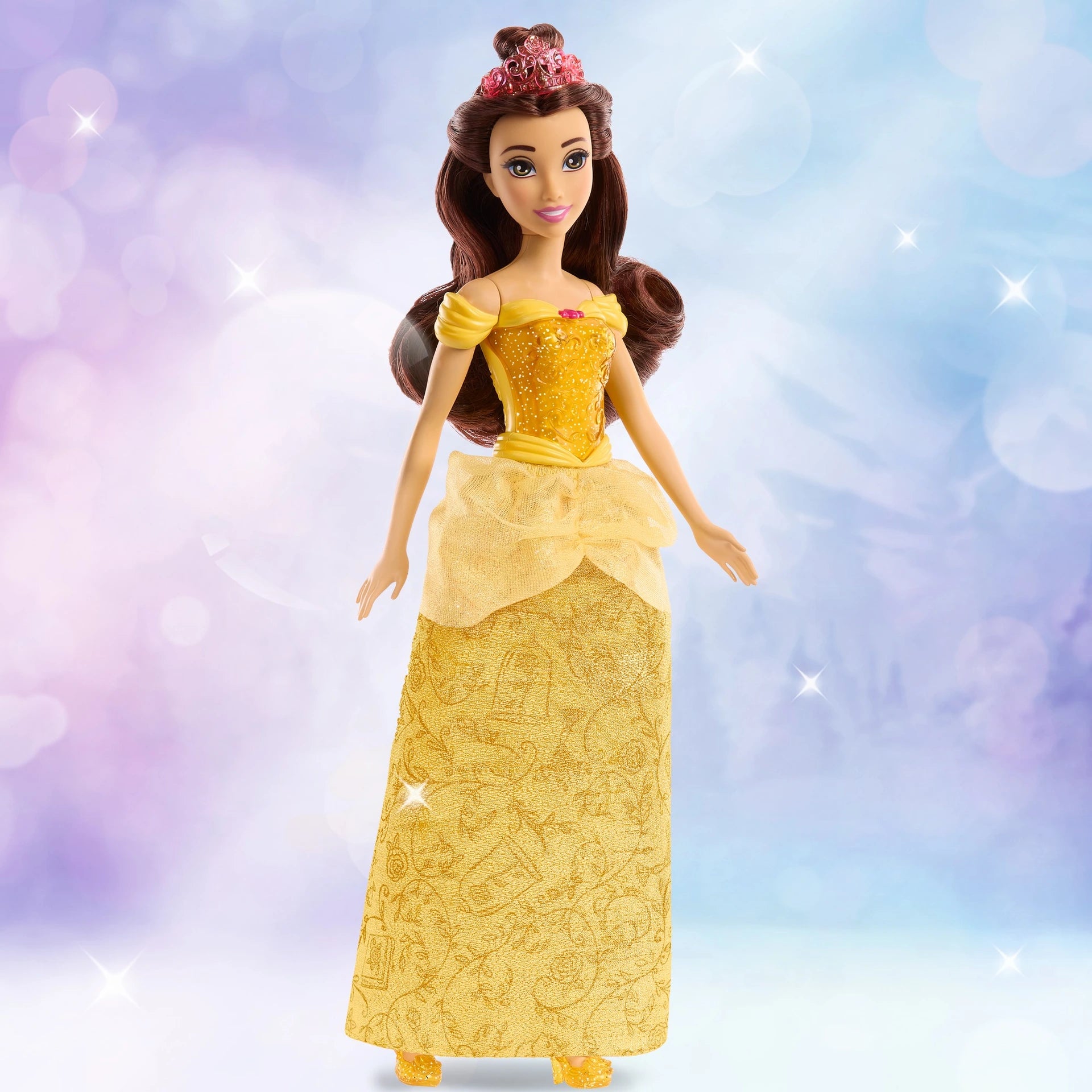 Meet this Belle doll, inspired by the intelligent and adventurous princess from Disney's Beauty and the Beast. This posable fashion doll is shown in a sparkling outfit and accessories that include shoes and a tiara. In her signature look from the movie, this Belle doll is ready for any adventure! Doll cannot stand alone. Colours and decorations may vary.