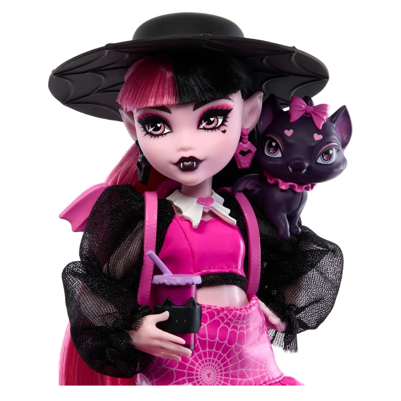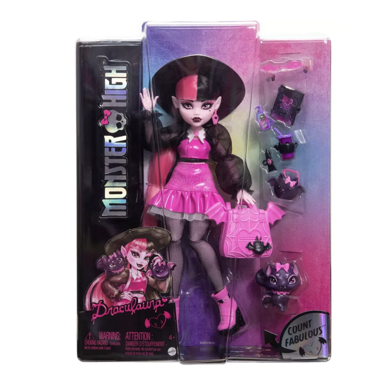 • Monster High Draculaura doll looks vamptastic in a wicked-cute outfit! She comes with her pet Count Fabulous, as well as defrightful accessories.