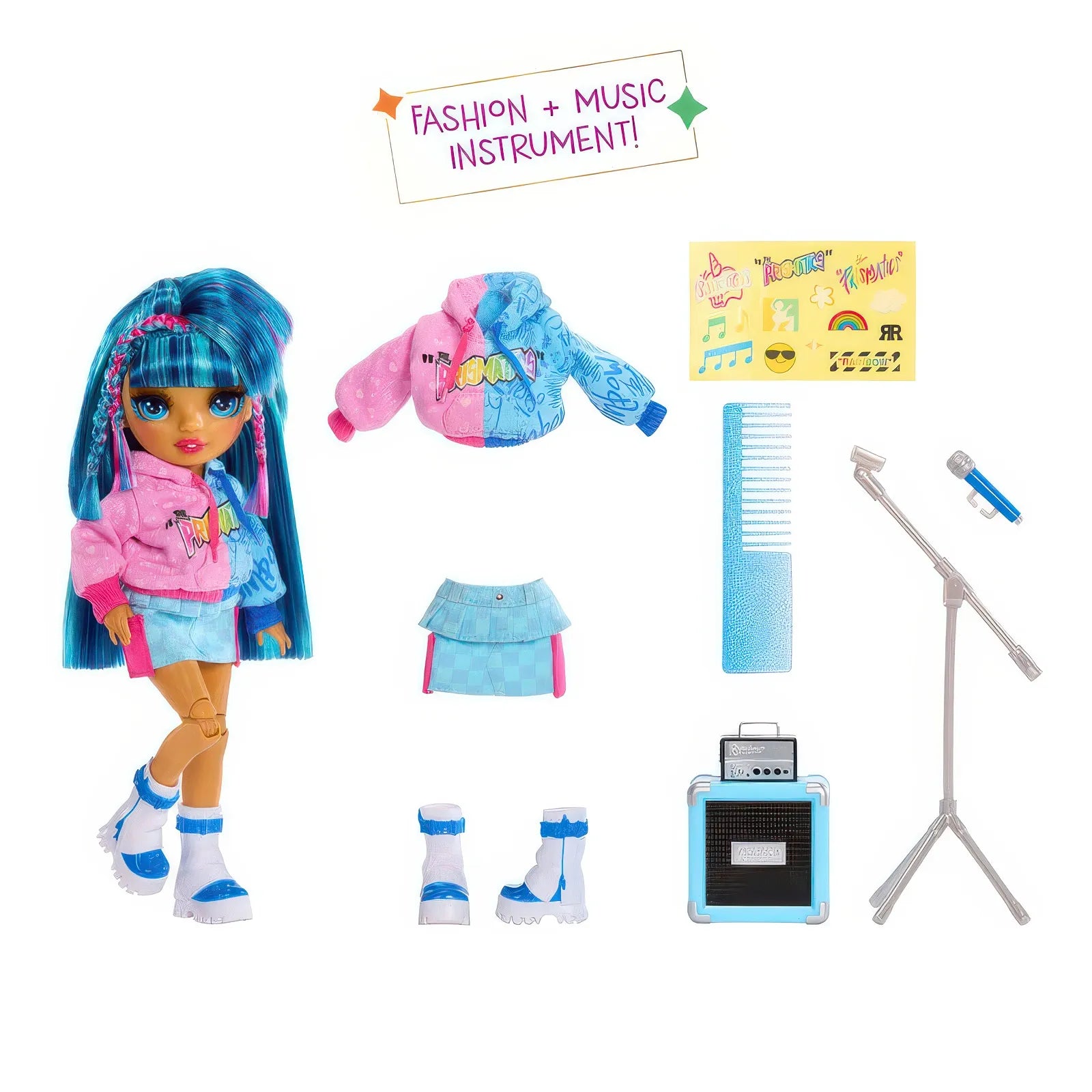 • WHAT'S INCLUDED. Fashion doll, a complete rock band outfit, instrument, stickers to customize the instrument, and a comb.