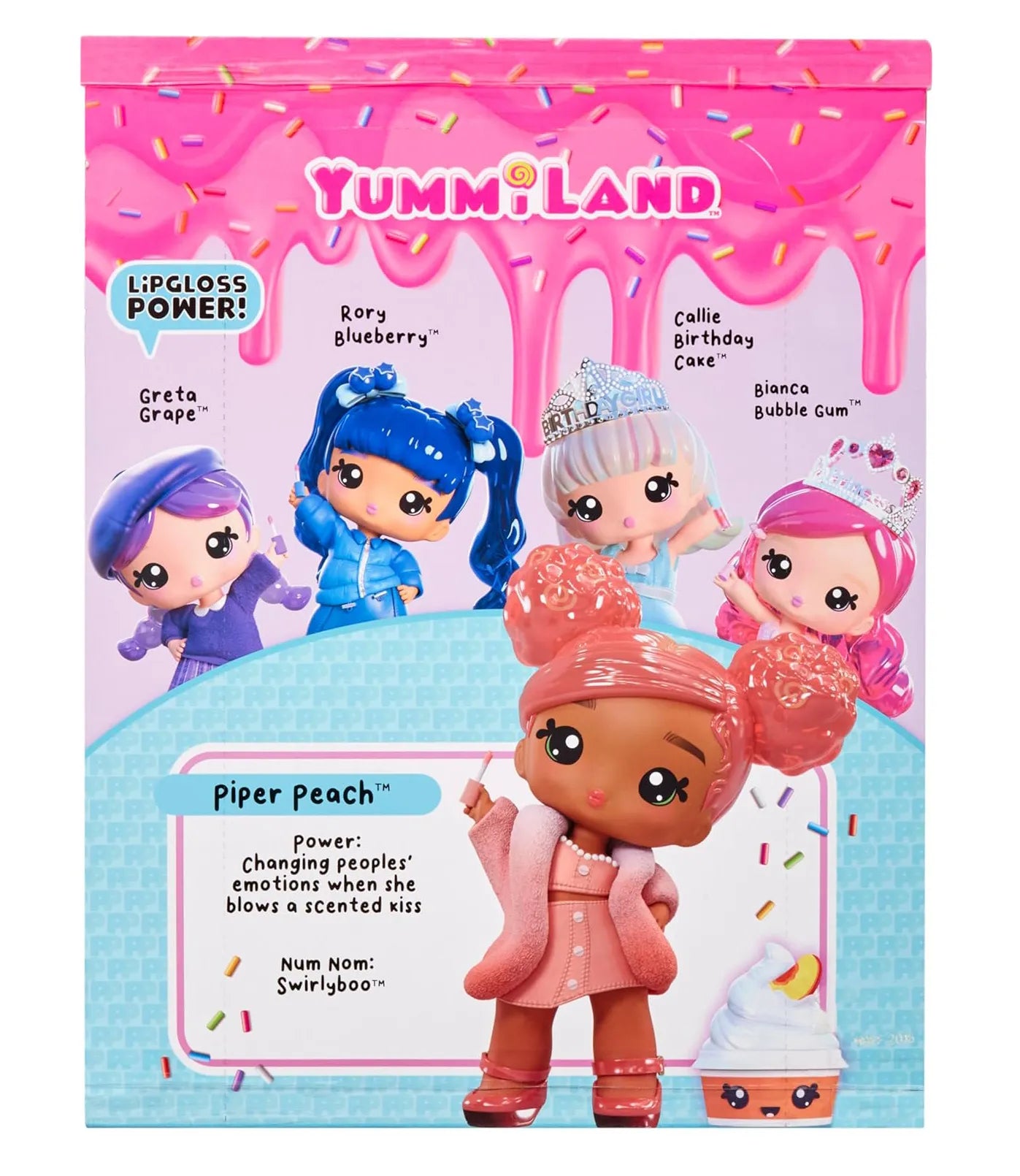 Welcome to Yummiland, where our brave Yummis team up to protect their incredible, edible city with magical lip gloss superpowers! Join them on their journey by creating your own real lip gloss included with your Yummiland doll and Num Nom pet. Each doll also features removable fashion, accessories, and a matching comb for styling their hair! Piper Peach lives in Yummiland with her team of fellow adventure-seeking Yummis where her special lip gloss gives her the superpower of ultra-kindness.