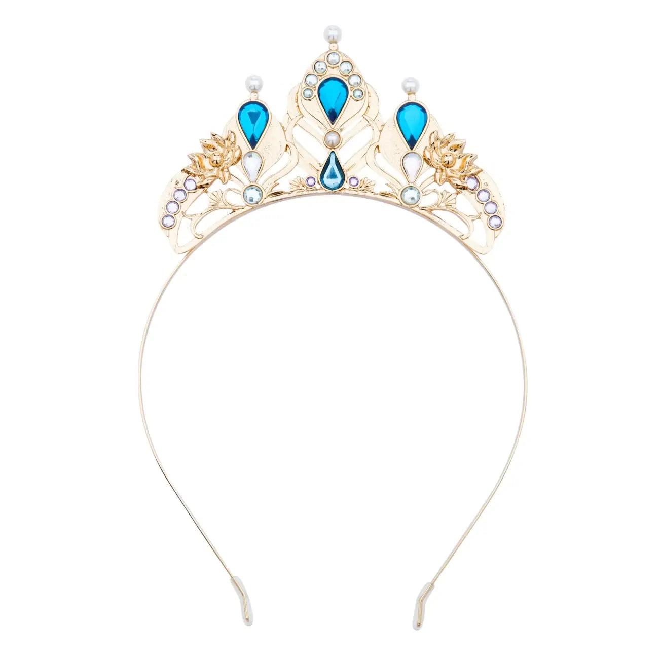 Attend the royal coronation of Princess Jasmine as she tops-off her ensemble with this rhinestone-embellished tiara. Lotus flowers, peacock feathers, faceted rhinestones and plastic pearls in golden filigree grant costume wishes worthy of a Sultan's daughter.