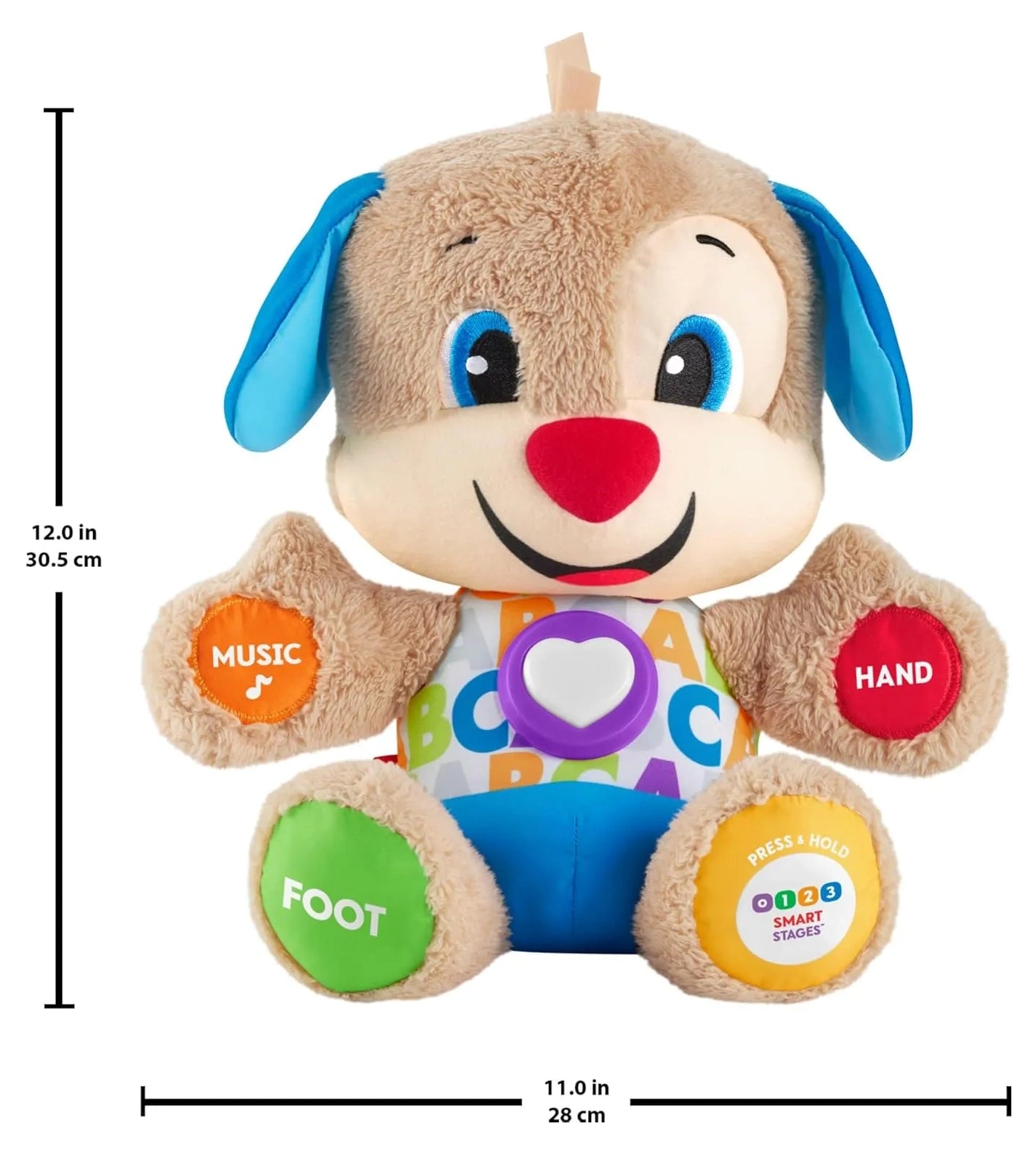 • Puppy’s hands, foot, ear, and light-up heart respond to baby’s touch (5 activations in all!)