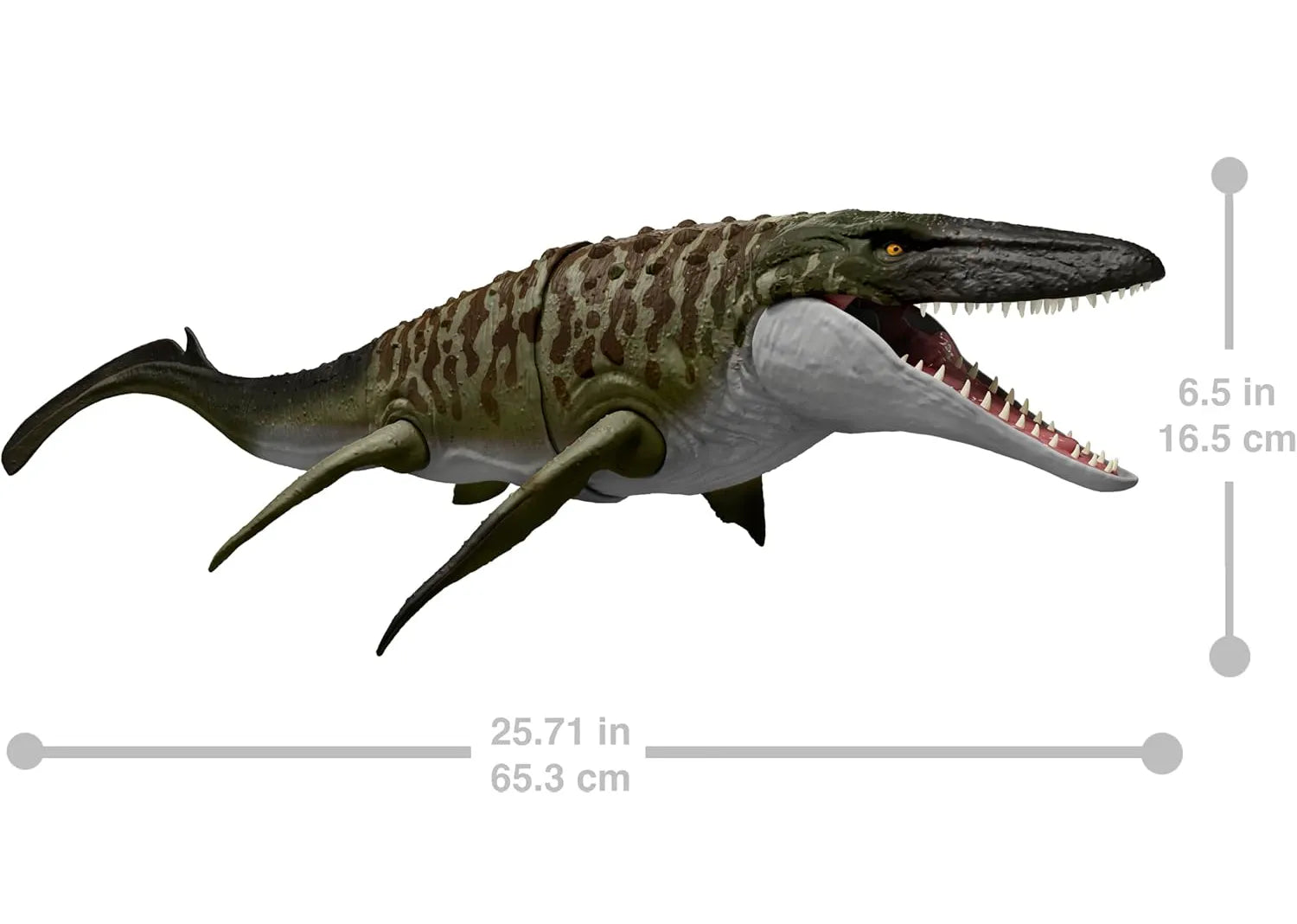 • Jurassic World lives! Bring the excitement and thrills of Jurassic World Rebirth home with this distinctive Mosasaurus with exciting Bite ‘N Blast moves, articulated fins and tail and 25.7-inch (ca. 65 cm) long size!