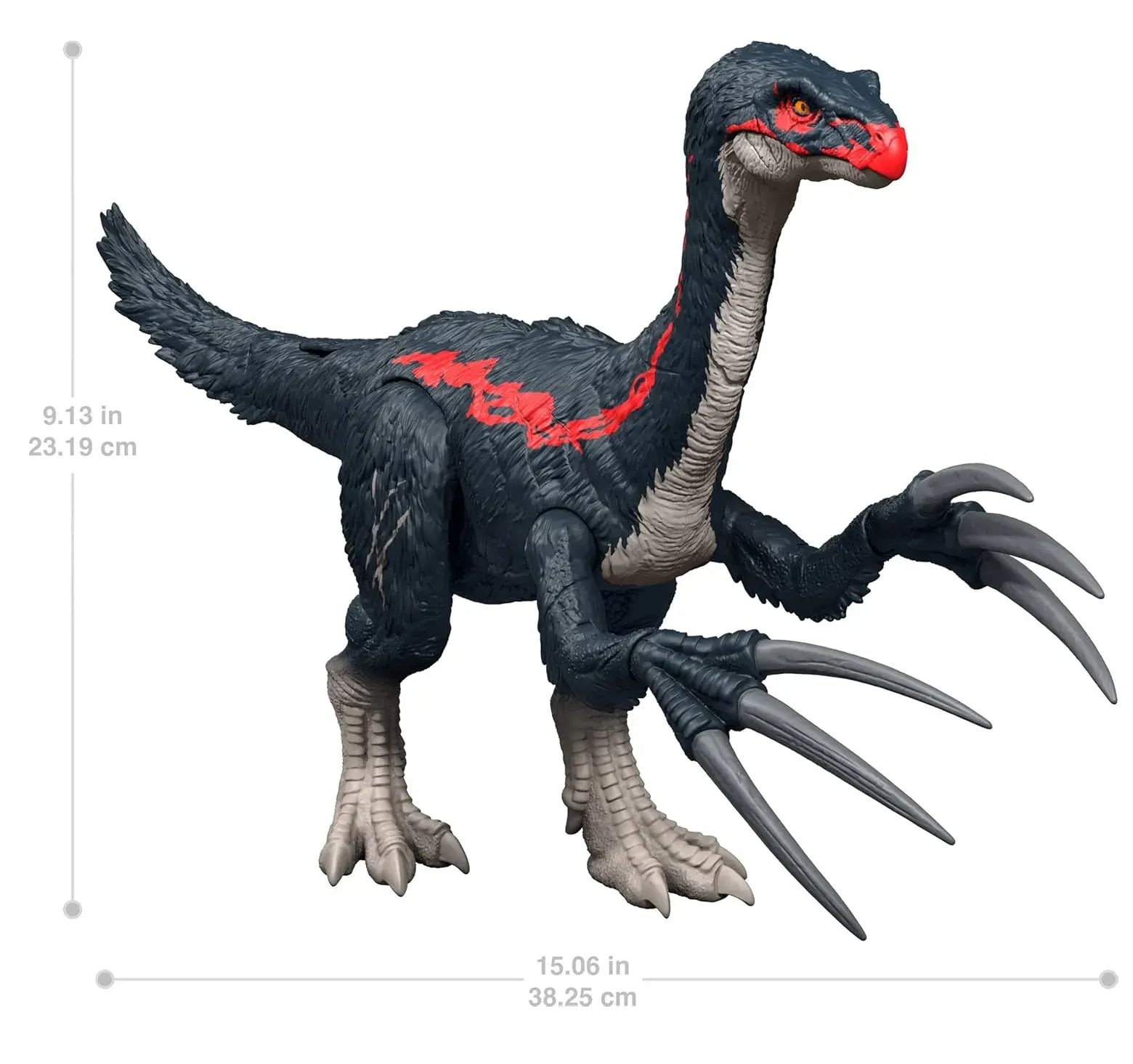 • Carnivorous chaos! The Jurassic World Therizinosaurus figure is content-accurate, with attack and sound features.