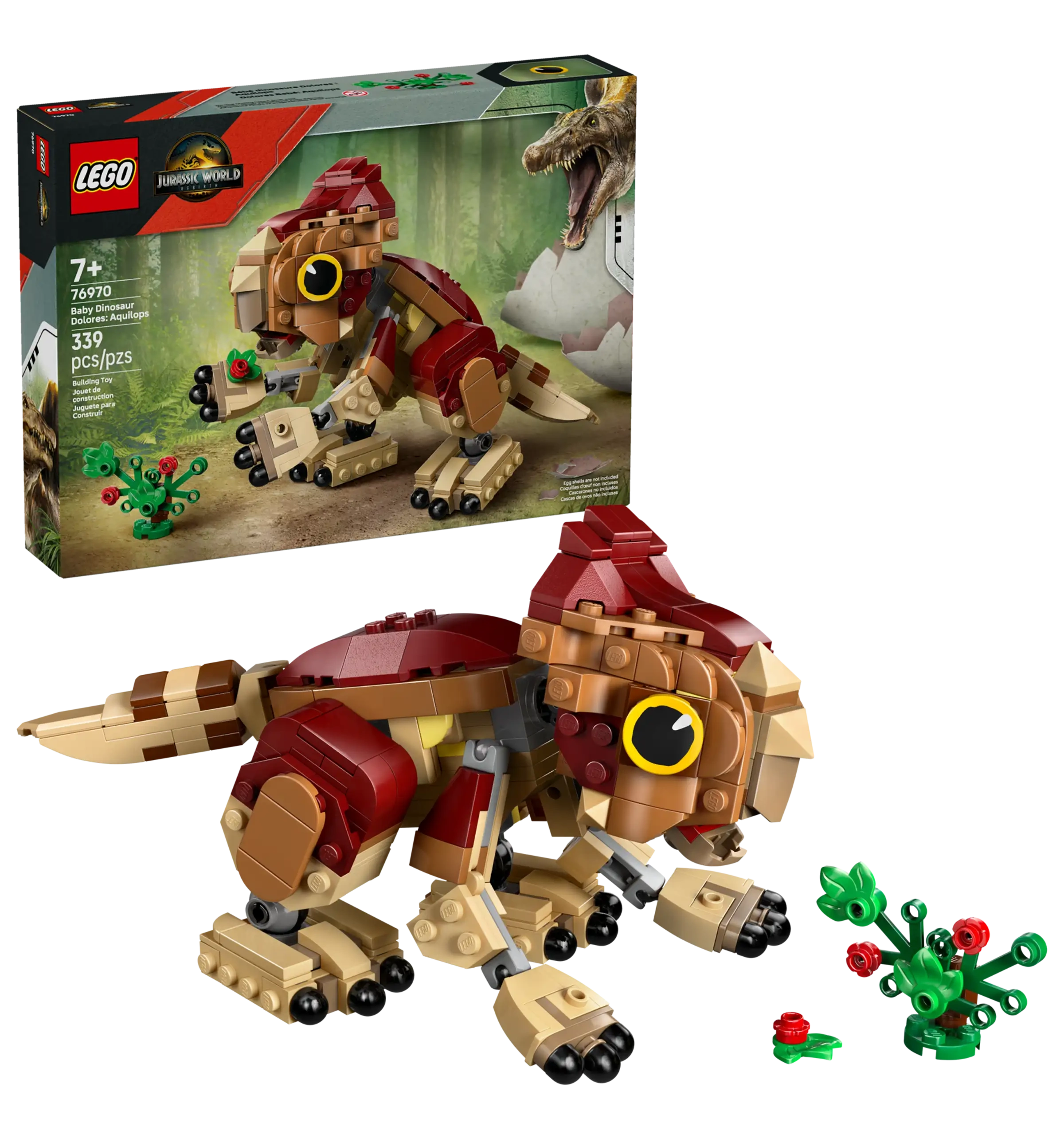 • Dinosaur dimensions – This Baby Dinosaur Dolores: Aquilops buildable toy includes 339 pieces and measures over 4.5 in. (11 cm) high, 7.5 in. (20 cm) long and 6 in. (15 cm) wide
