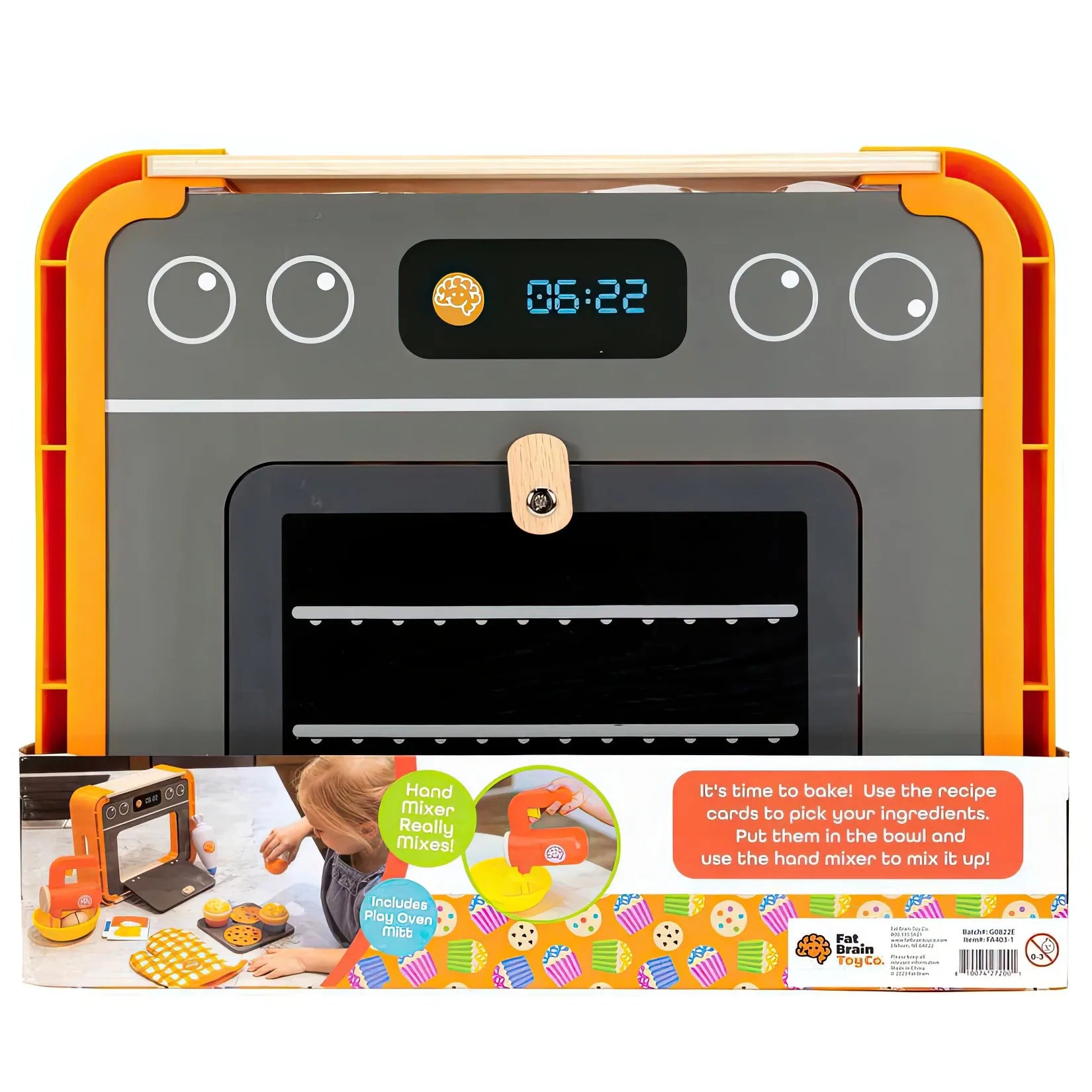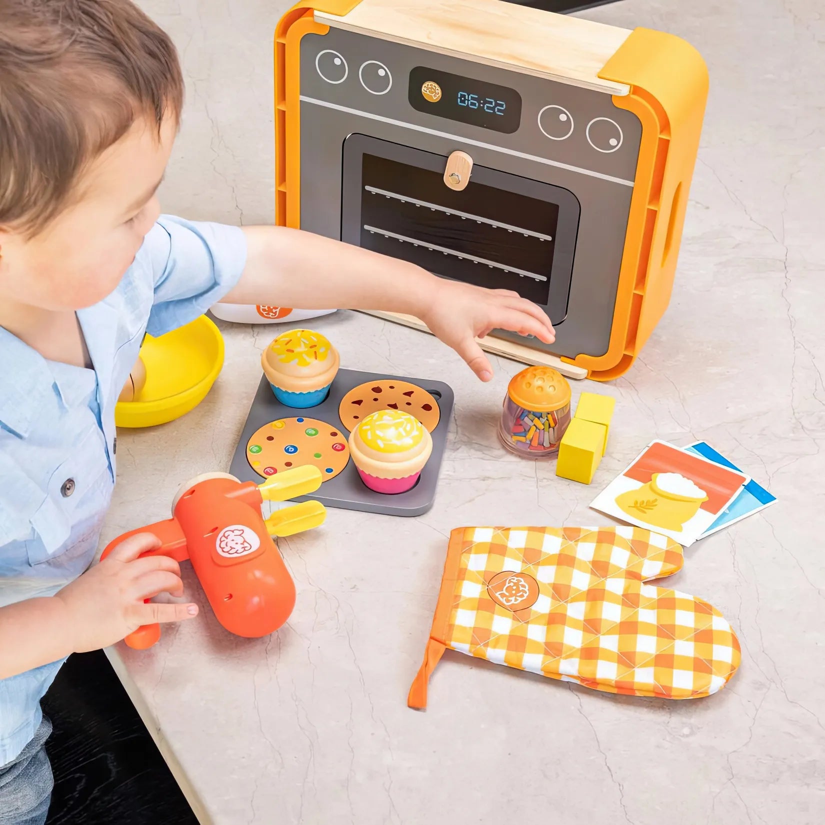 • Includes mixer, sprinkle shaker, bowl, 2 egg halves, 2 chunks of butter, 2 cupcakes, 2 cookies, baking tray, piping bag, oven mitt, ingredient cards, oven/storage crate