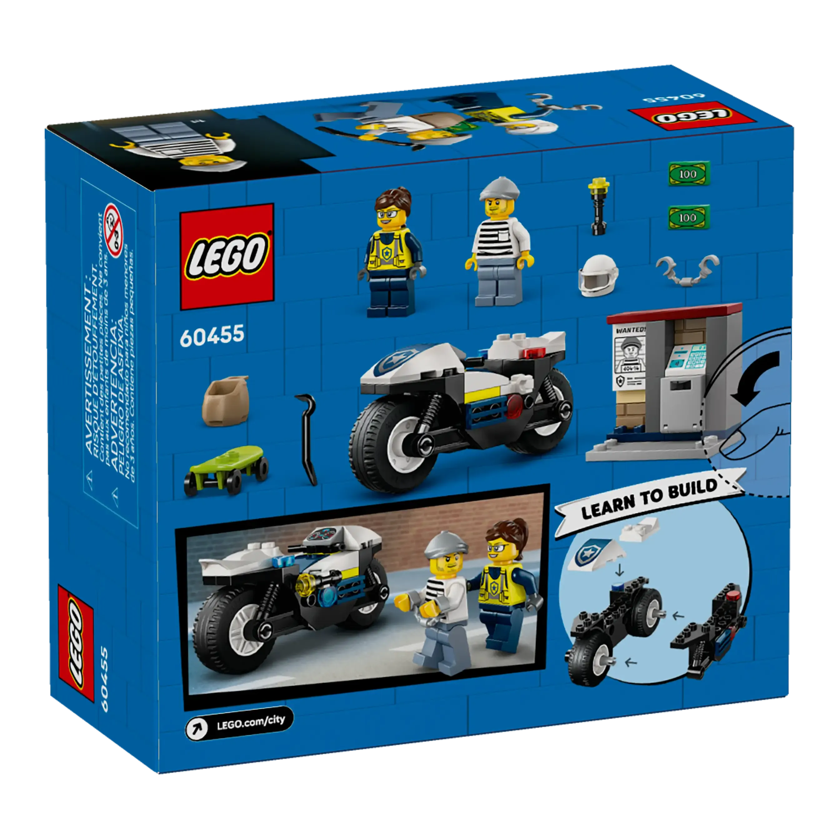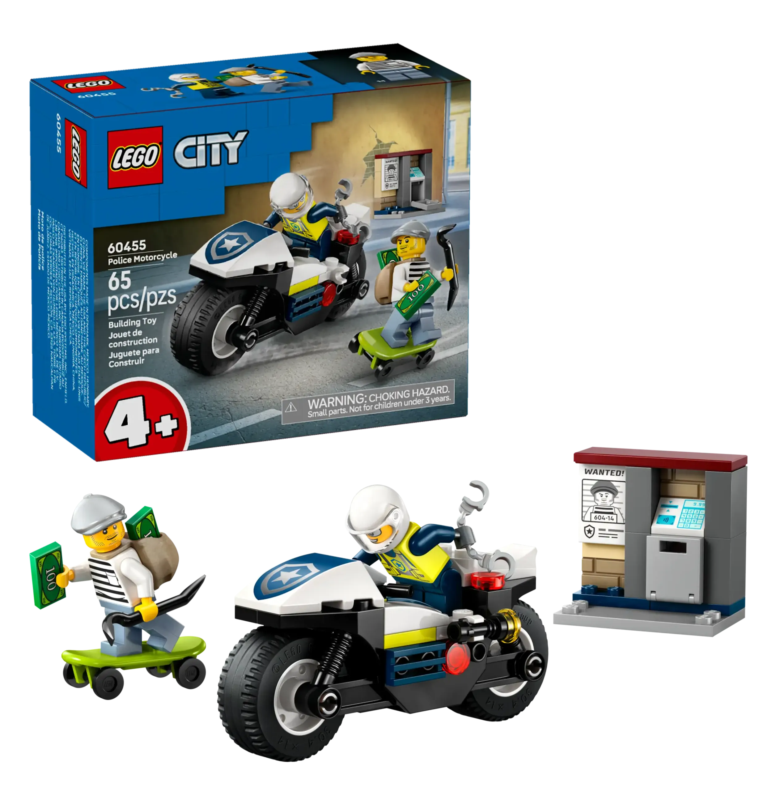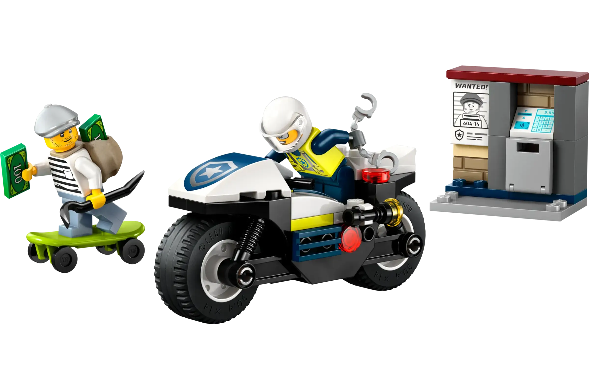 Surprise your young action hero with this exciting LEGO® City Police Motorcycle Chase (60455) playset. Perfect for little builders aged 4 and up, it features a cool police motorbike with wide tires, a crook’s getaway skateboard and an opening mini-ATM with a toy banknote. Just add the police officer and crook minifigures for hours of imaginative play and storytelling.