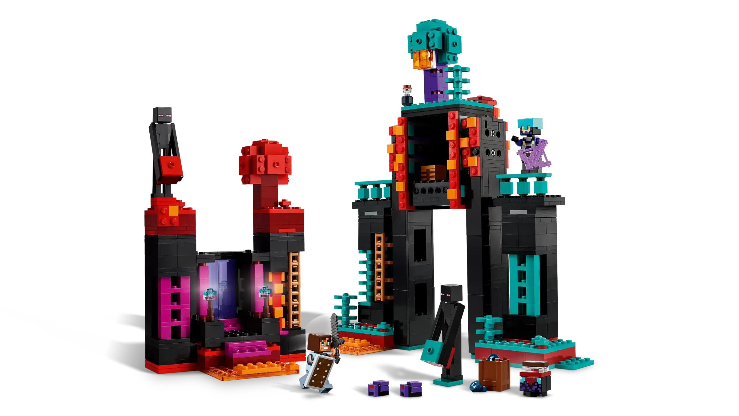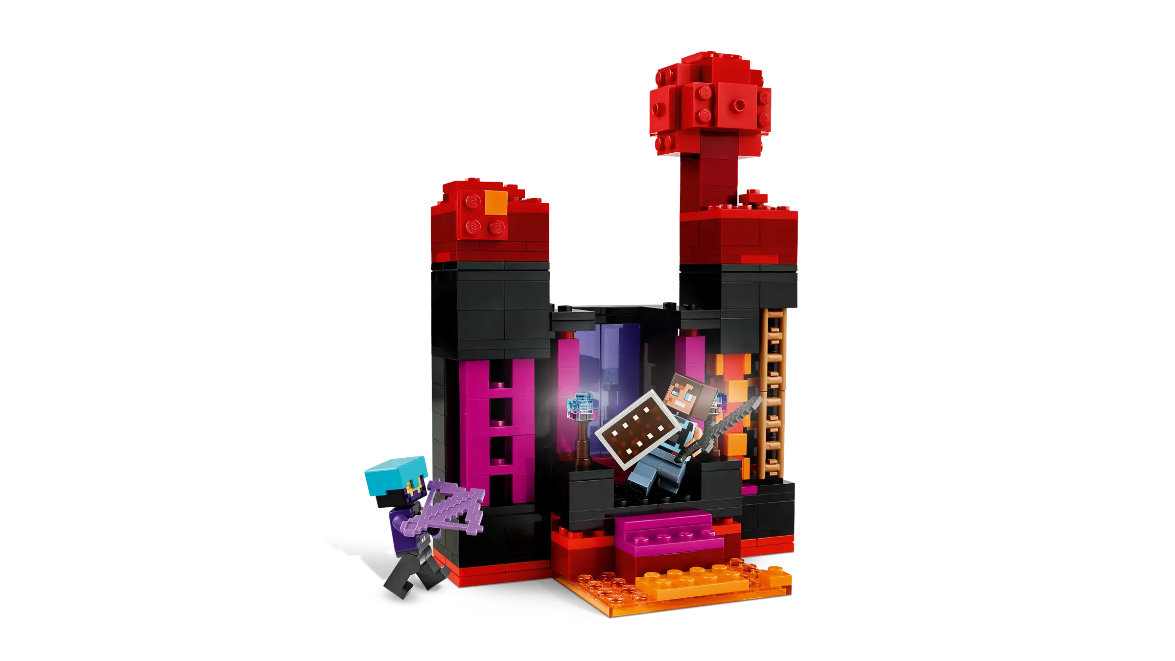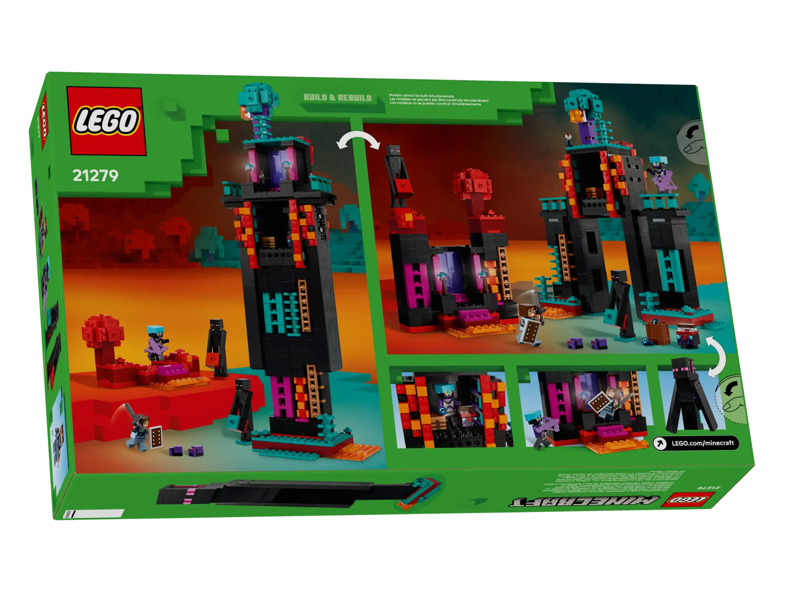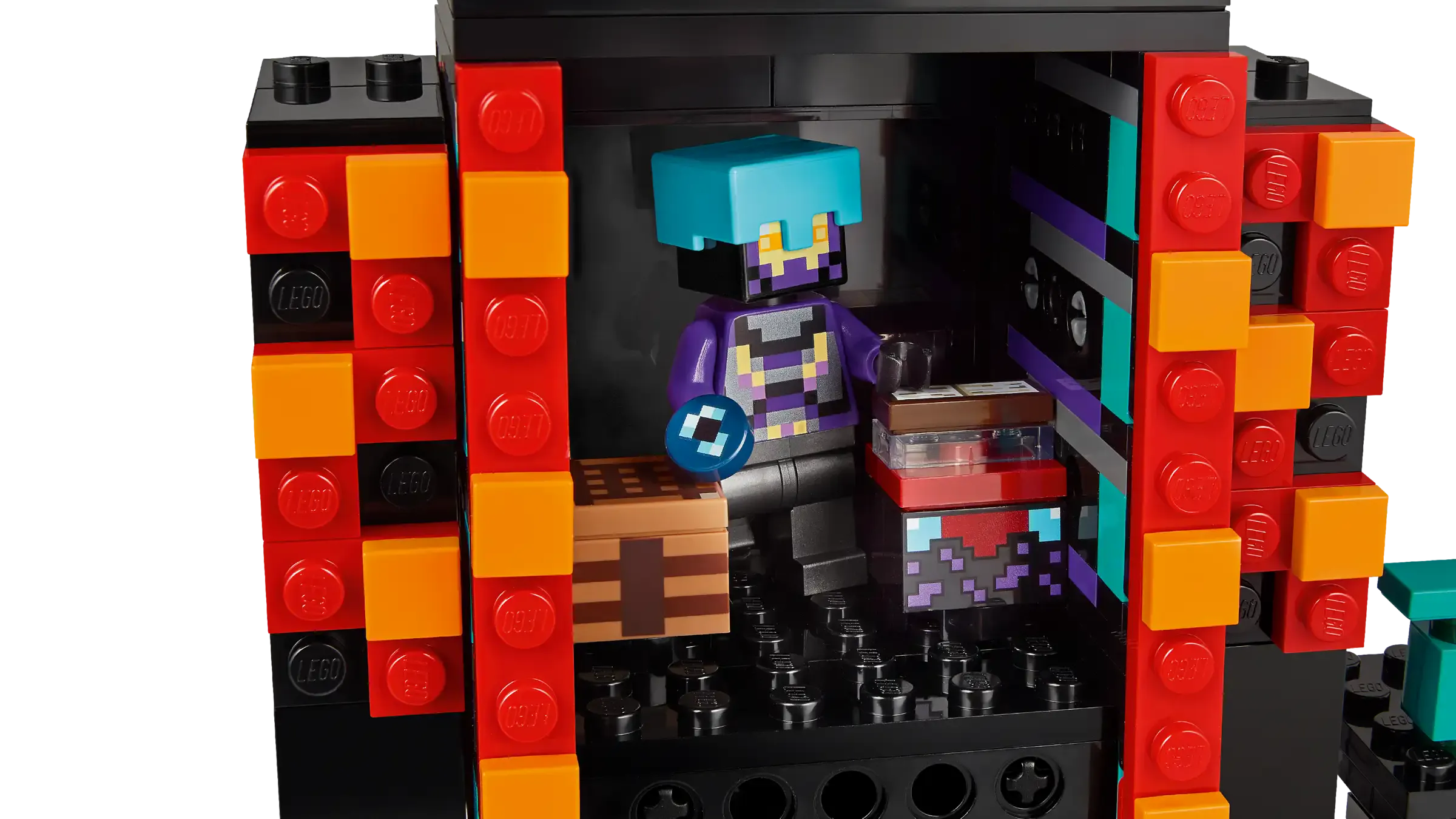 The primary build is an Enderman-shaped tower with a Nether portal in its head, a balcony on each shoulder and 2 rooms containing a crafting table, an enchanting table and a storage box for Ender pearls. Ladders provide access up the legs, the posable arms are fully articulated, and outside are elements of the warped forest and crimson forest biomes. The set features a Dimensional Defender, Realm Raider and 2 Enderman minifigures, plus 2 Endermite mob figures. Weapons include a Minecraft crossbow and netherite sword and shield. The Enderman Tower model can be rebuilt into 2 colour-coded fortresses, which is great for PvP (Player versus Player) action. Build with the LEGO® Builder app. Contains 867 pieces.