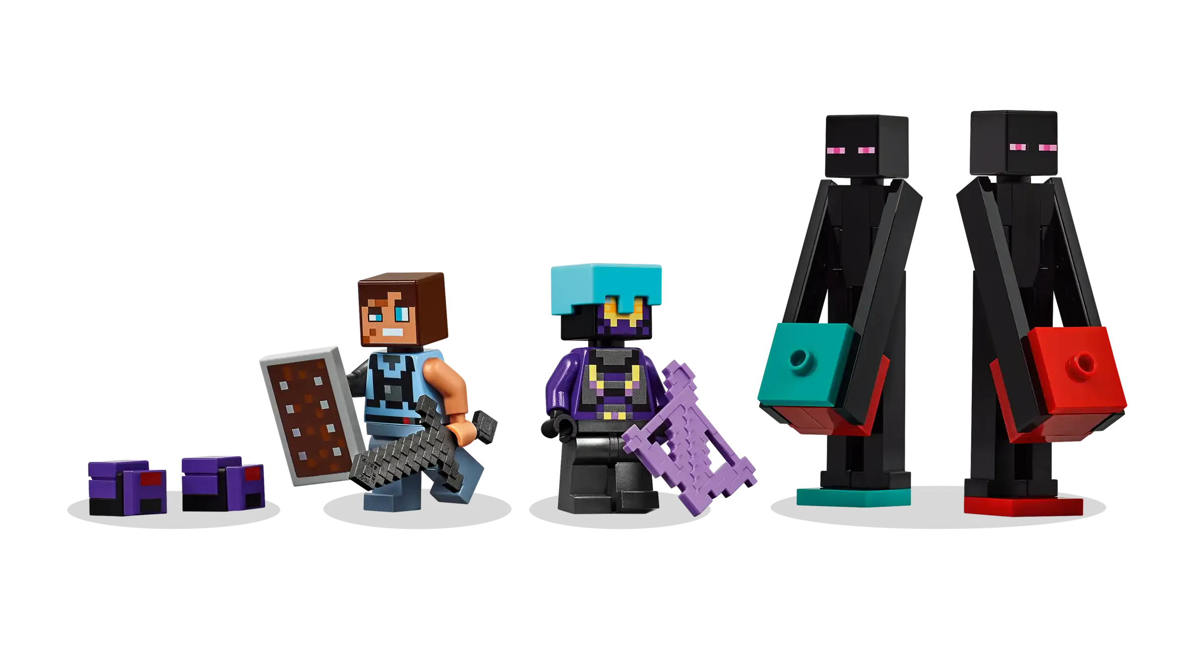 • Collectible video game figures – The set features a Dimensional Defender, a Realm Raider, 2 Enderman minifigures and 2 Endermite mob figures, and an enchanted crossbow and a netherite sword and shield