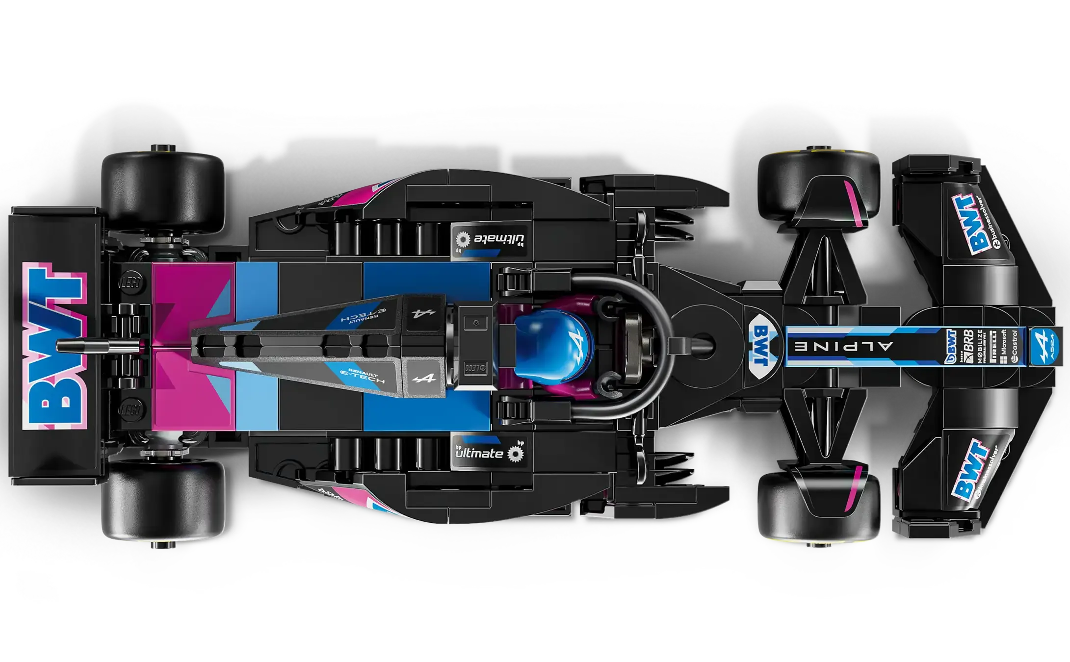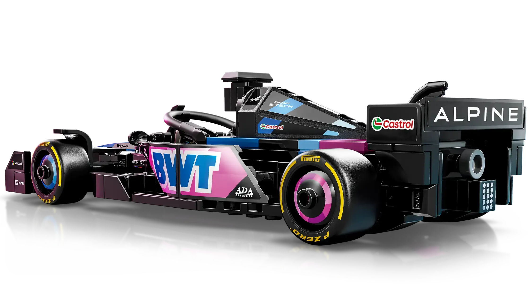 • Authentic BWT Alpine F1® Team details – F1 race car with design details from the real-life 2024 version, including a halo bar, a rear wing, sponsor stickers and wider rear tires imprinted with “Pirelli”