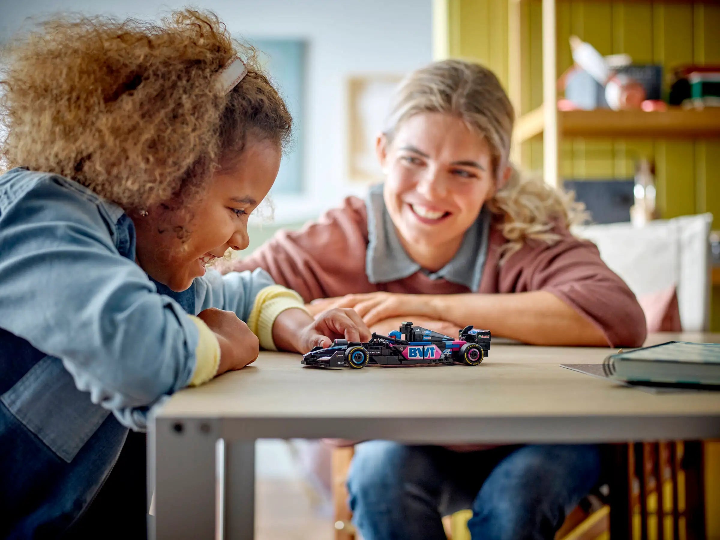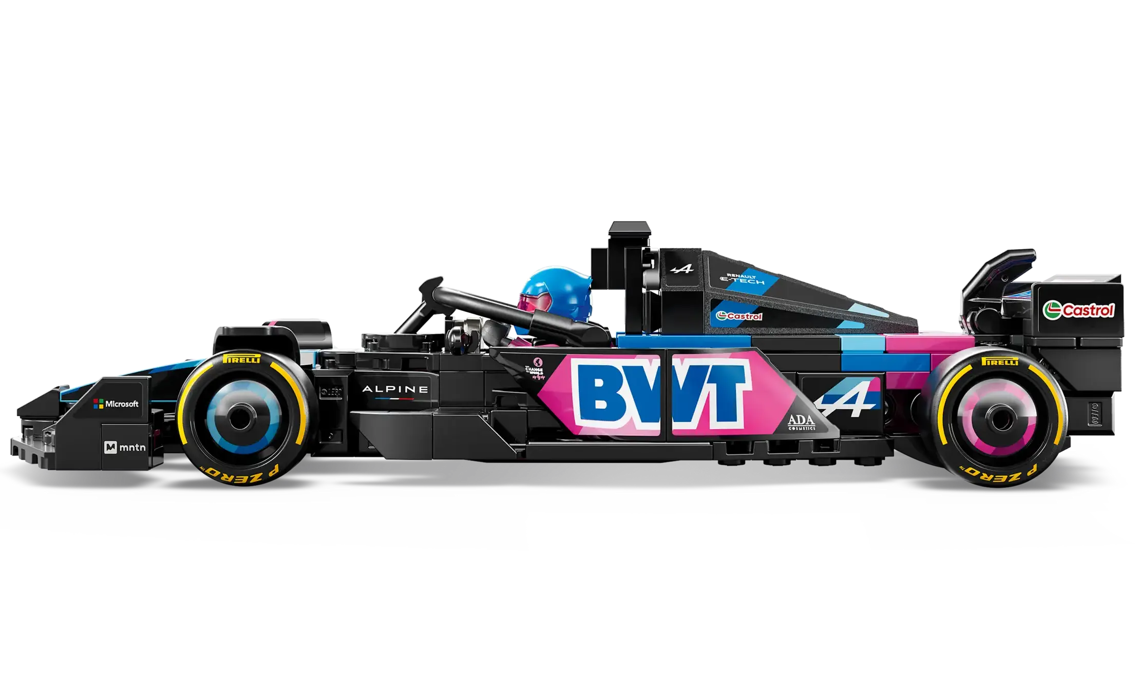 The F1 model car features a cockpit that opens by lifting the halo bar, a rear wing, wishbone suspension, sponsor stickers and wider rear tires imprinted with “Pirelli.” The race car toy also includes a driver minifigure wearing an Alpine outfit and a winged helmet to place inside the cockpit.