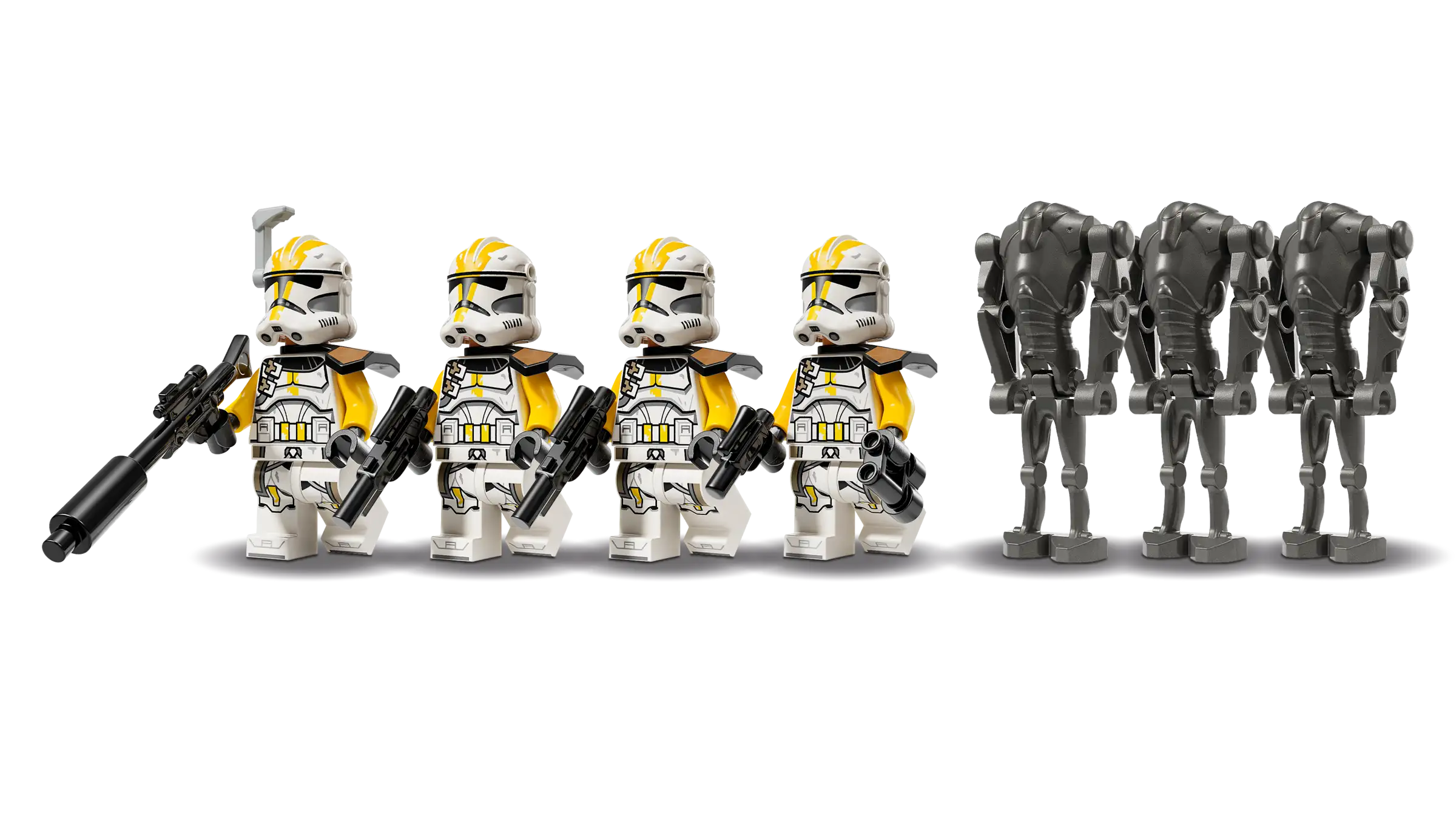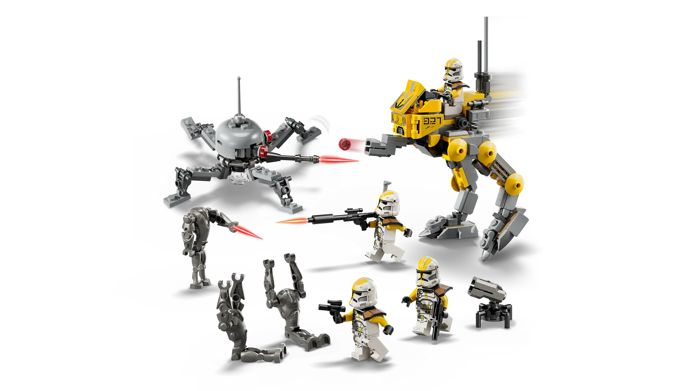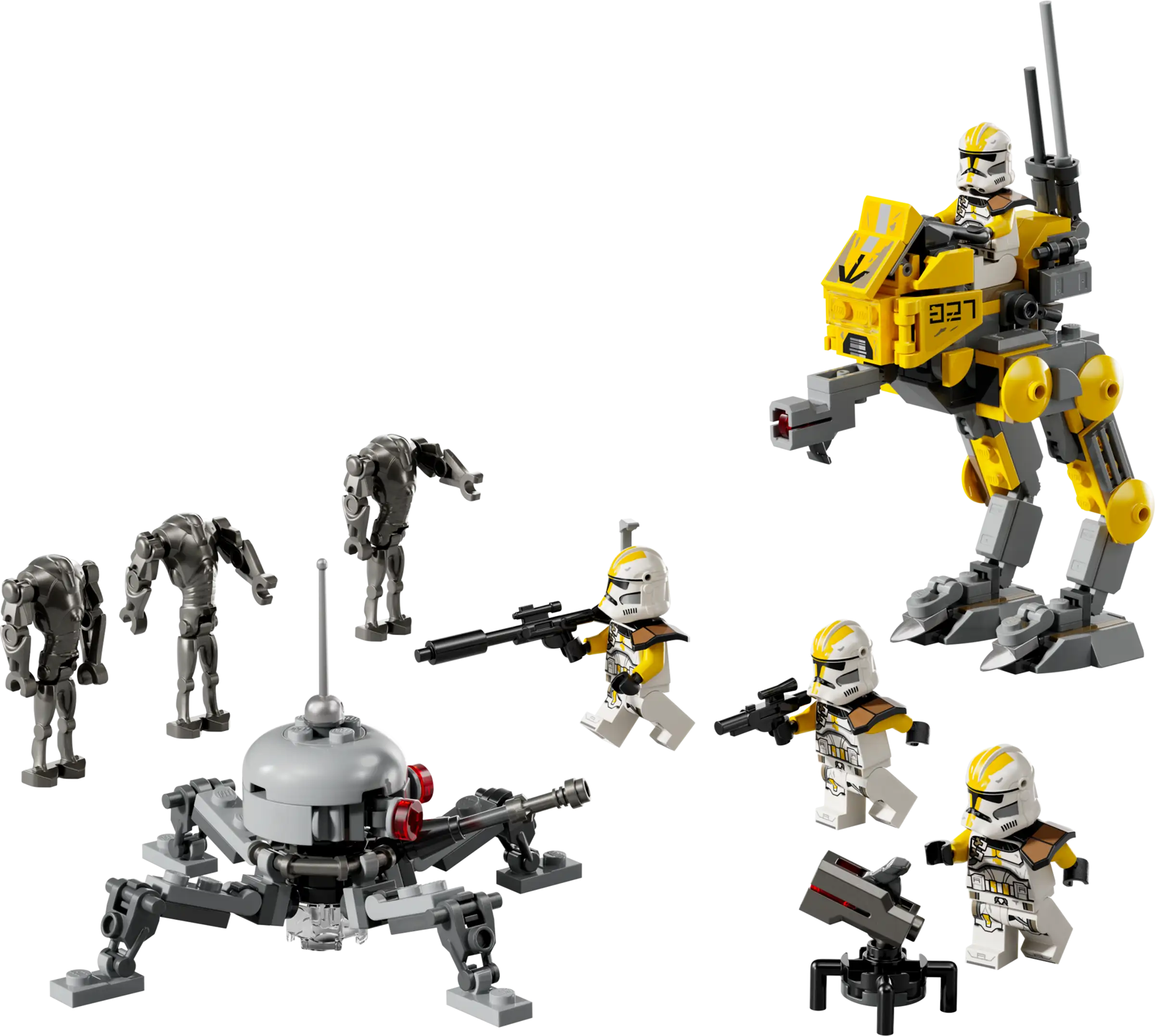 • 4 LEGO® Star Wars™ minifigures – 4 327th Clone Troopers with a blaster pistol, 2 blasters and a blaster rifle, plus 3 Super Battle Droid LEGO figures