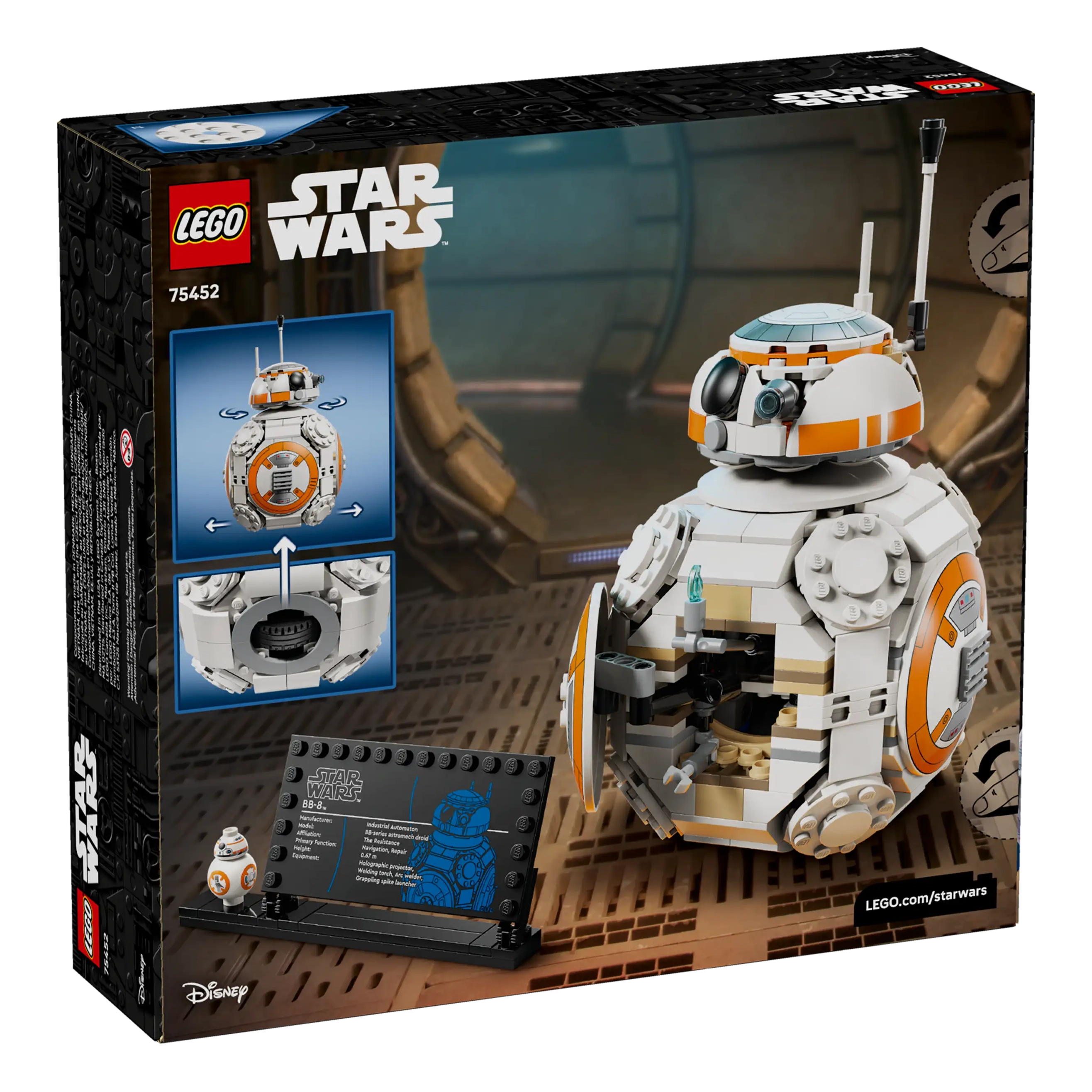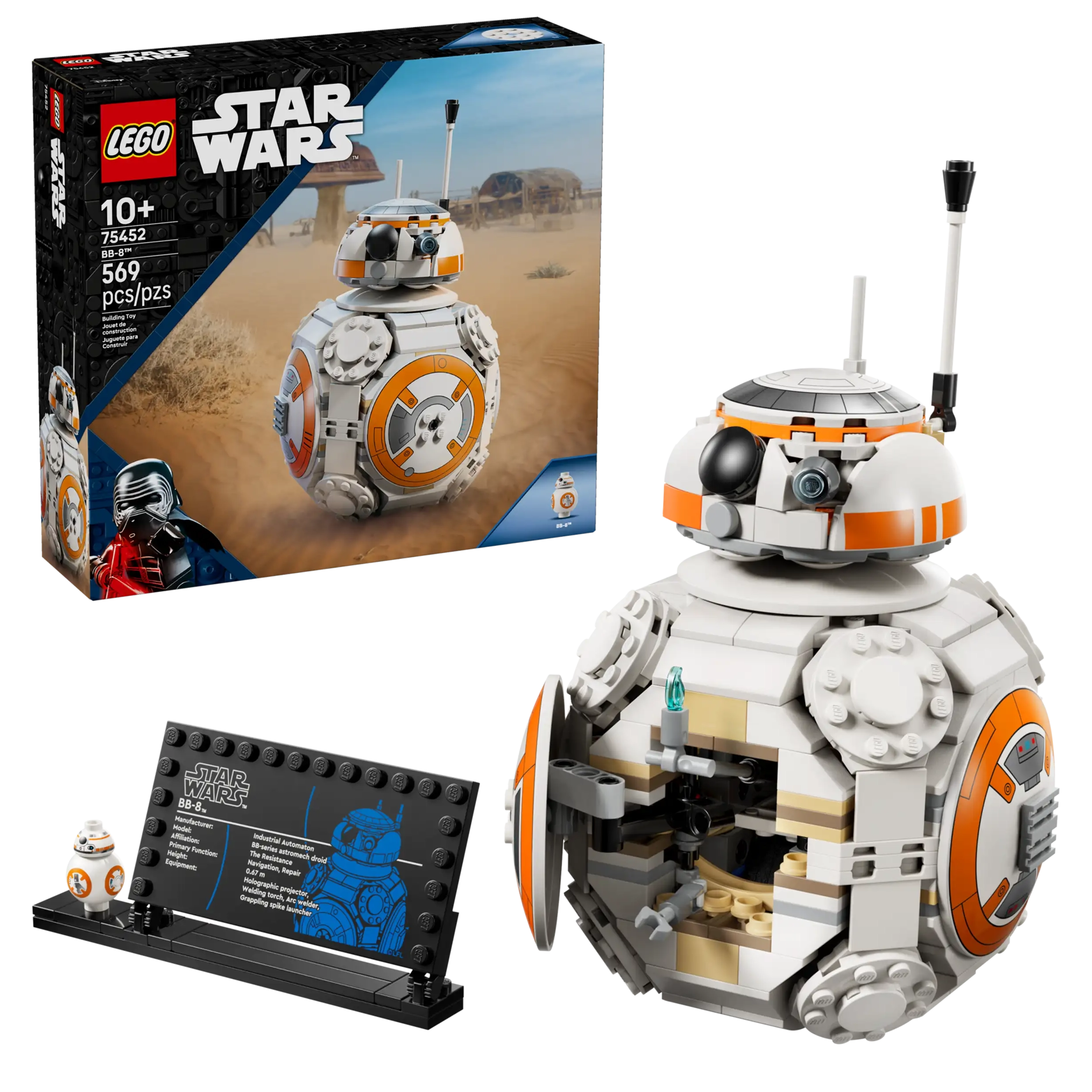 • BB-8 LEGO® FIGURE – Display the main buildable toy model with the BB-8 info plaque and standard-sized BB-8 LEGO figure
