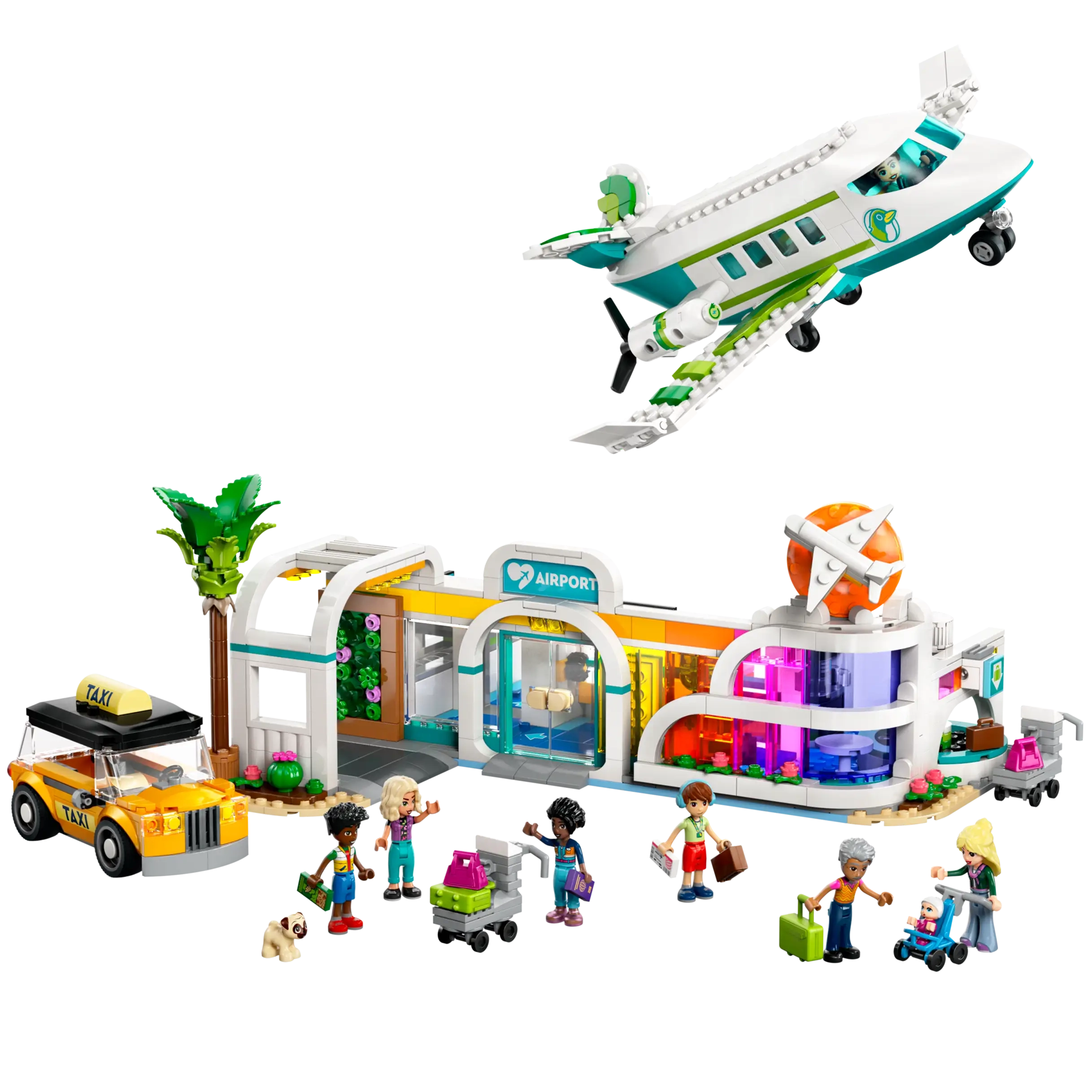 This building kit lets young imaginations take flight as kids aged 8 and up imagine travel adventures with the LEGO® Friends Heartlake City Airport and Aeroplane playset (42656). The set features a buildable passenger aeroplane, airport, taxi, 2 luggage carts and 8 LEGO Friends characters – including a baby – plus a dog figure.