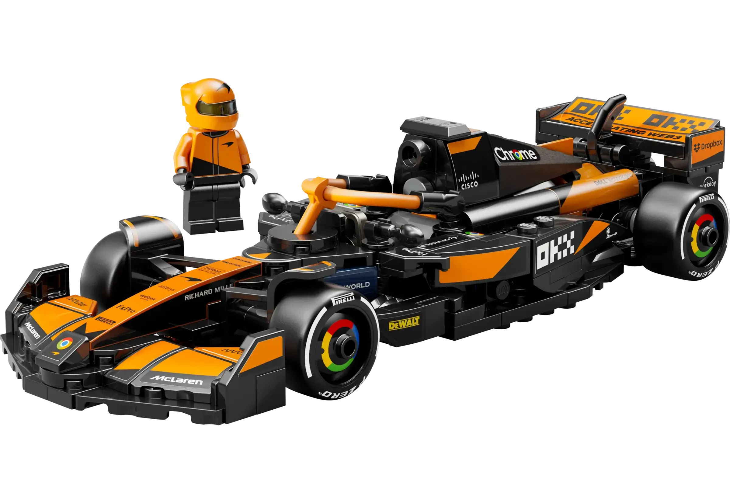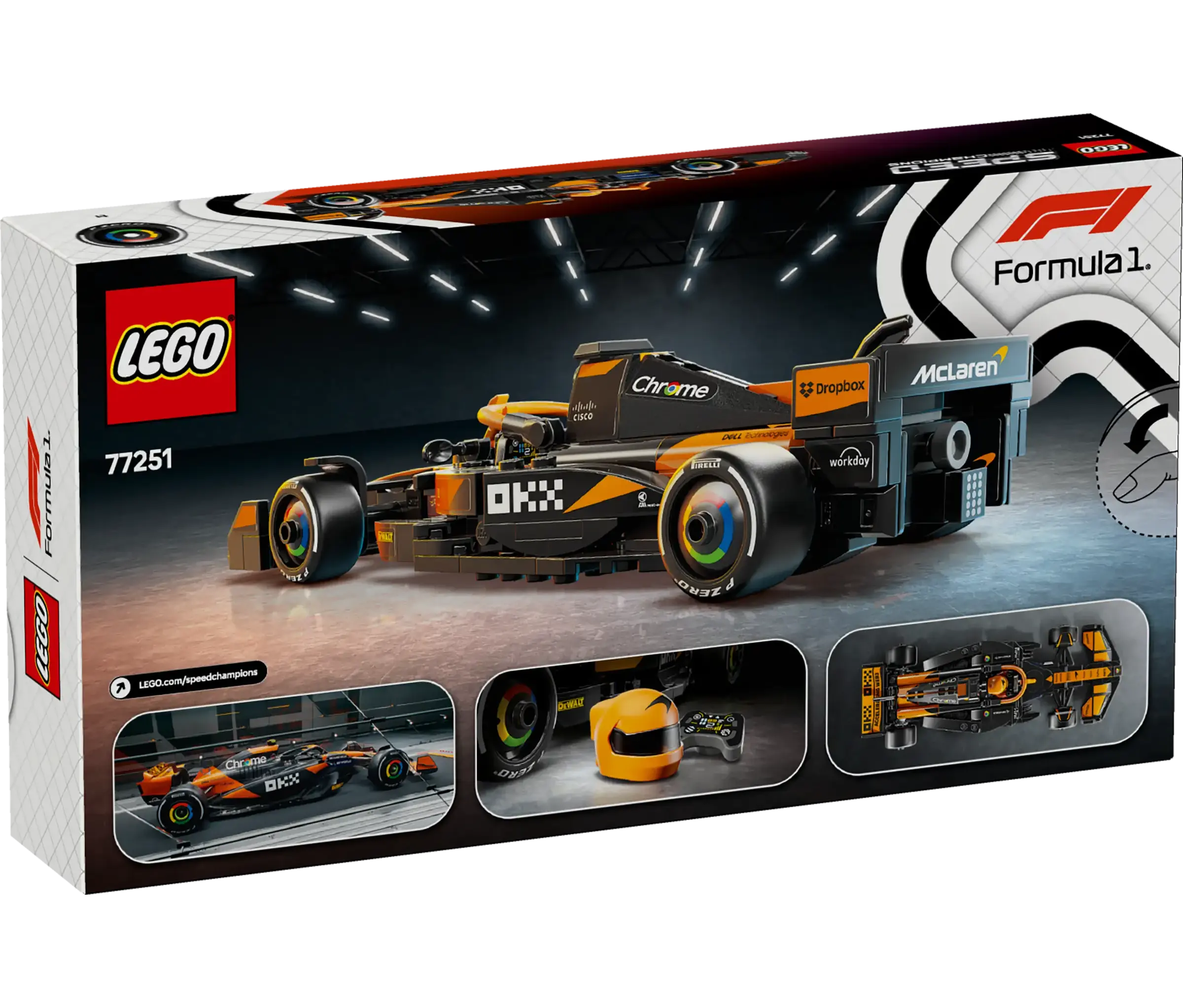 • Authentic McLaren F1® Team details – A McLaren F1 car with details from the real-life 2024 version, including a halo bar, rear wing, sponsor stickers and wider rear tires imprinted with “Pirelli”
