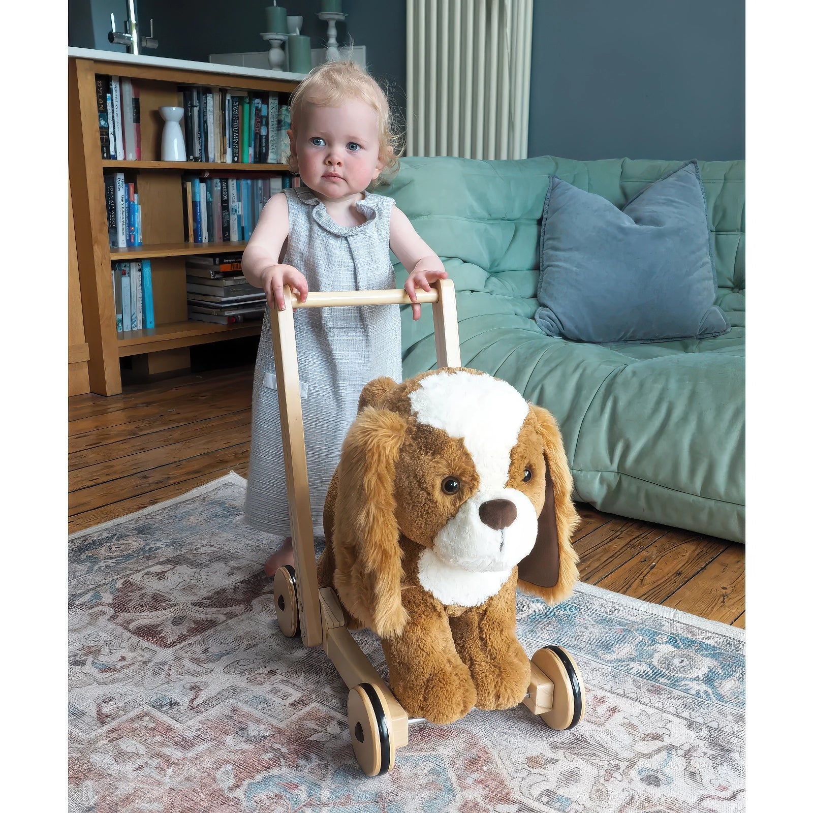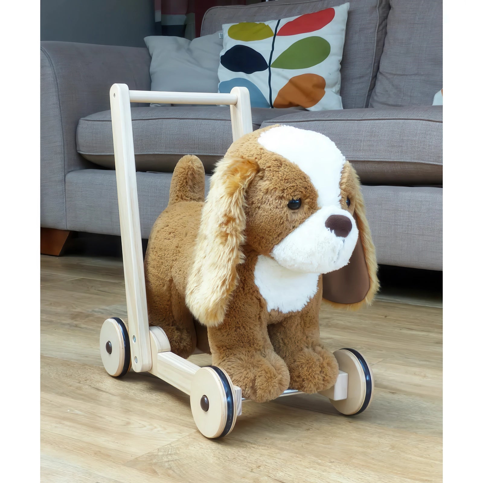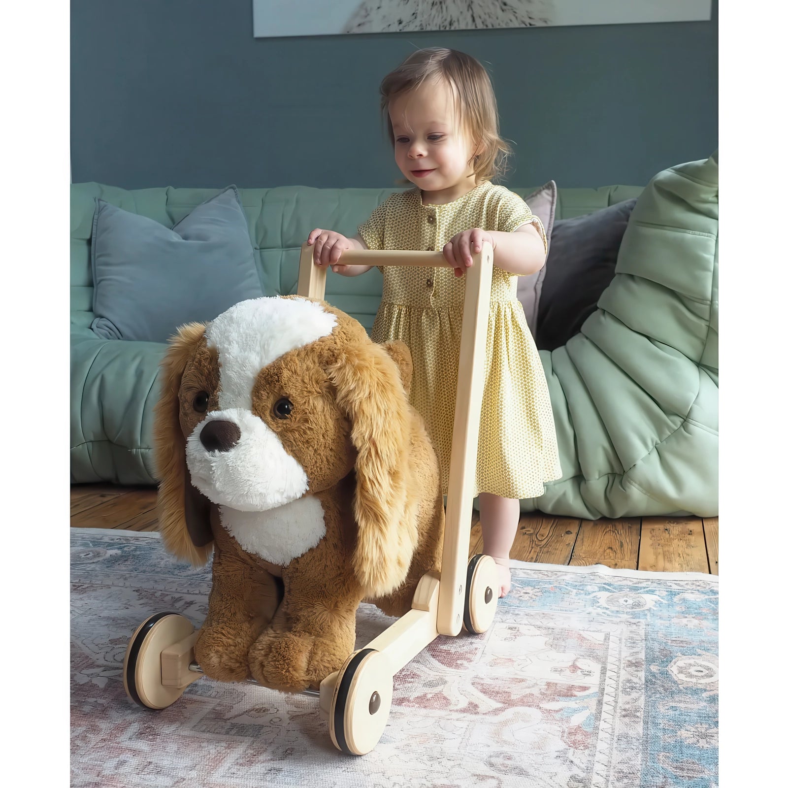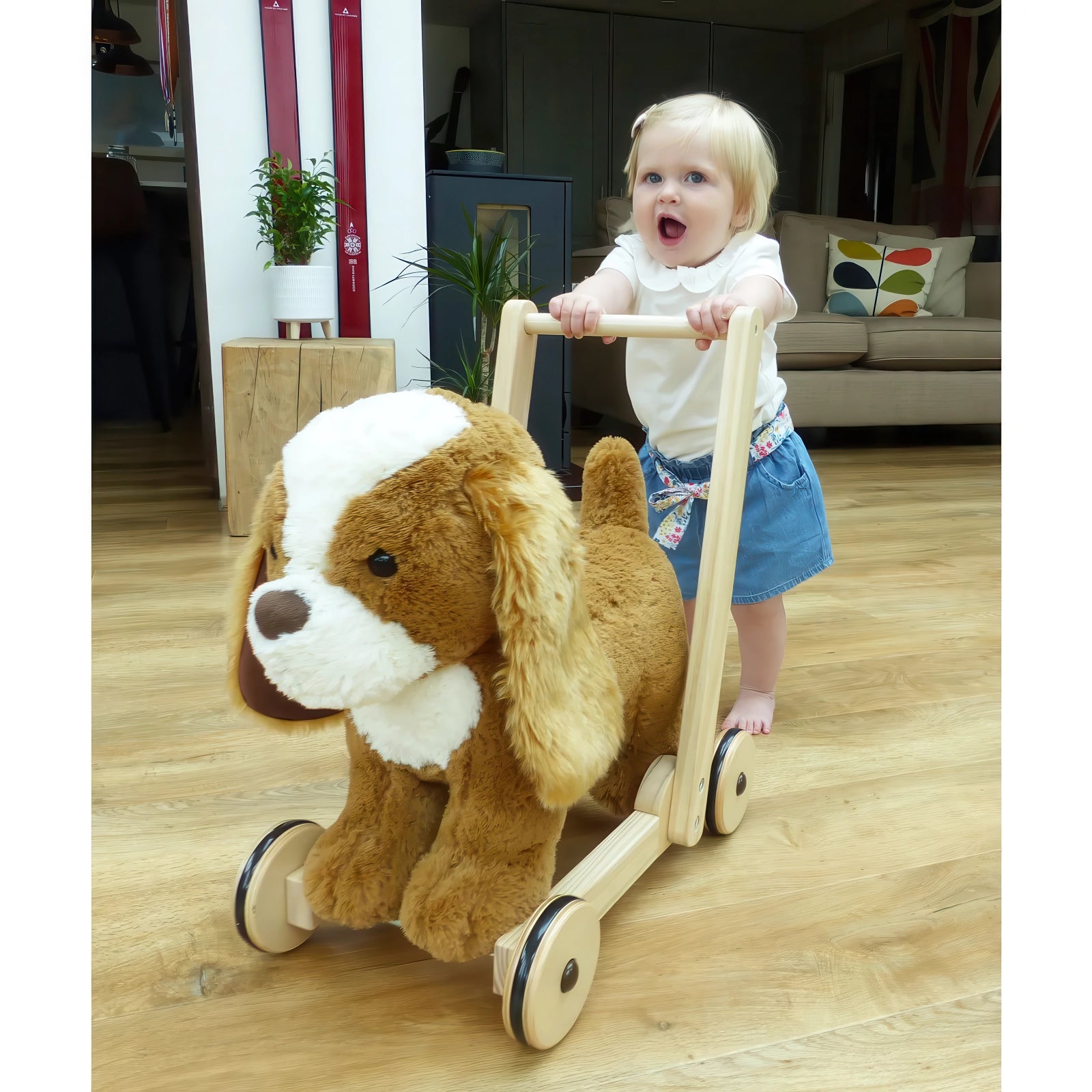 With his luxuriously soft golden coat, floppy ears, and a cute button nose, Peanut captures hearts at first sight. Children can enjoy walking with him by their side or hopping on for a gentle ride around the house. A sturdy wooden frame and smooth rubber tyres make it safe and stable for indoor use, while the thoughtfully designed seat is just the right size for growing toddlers.