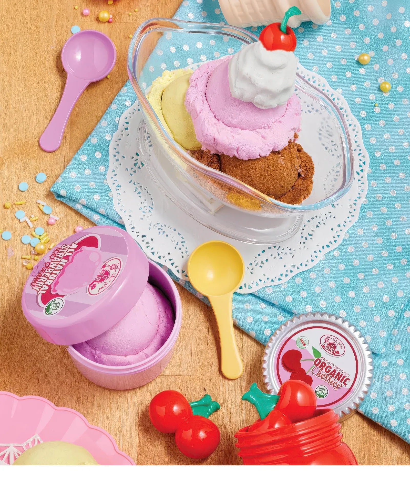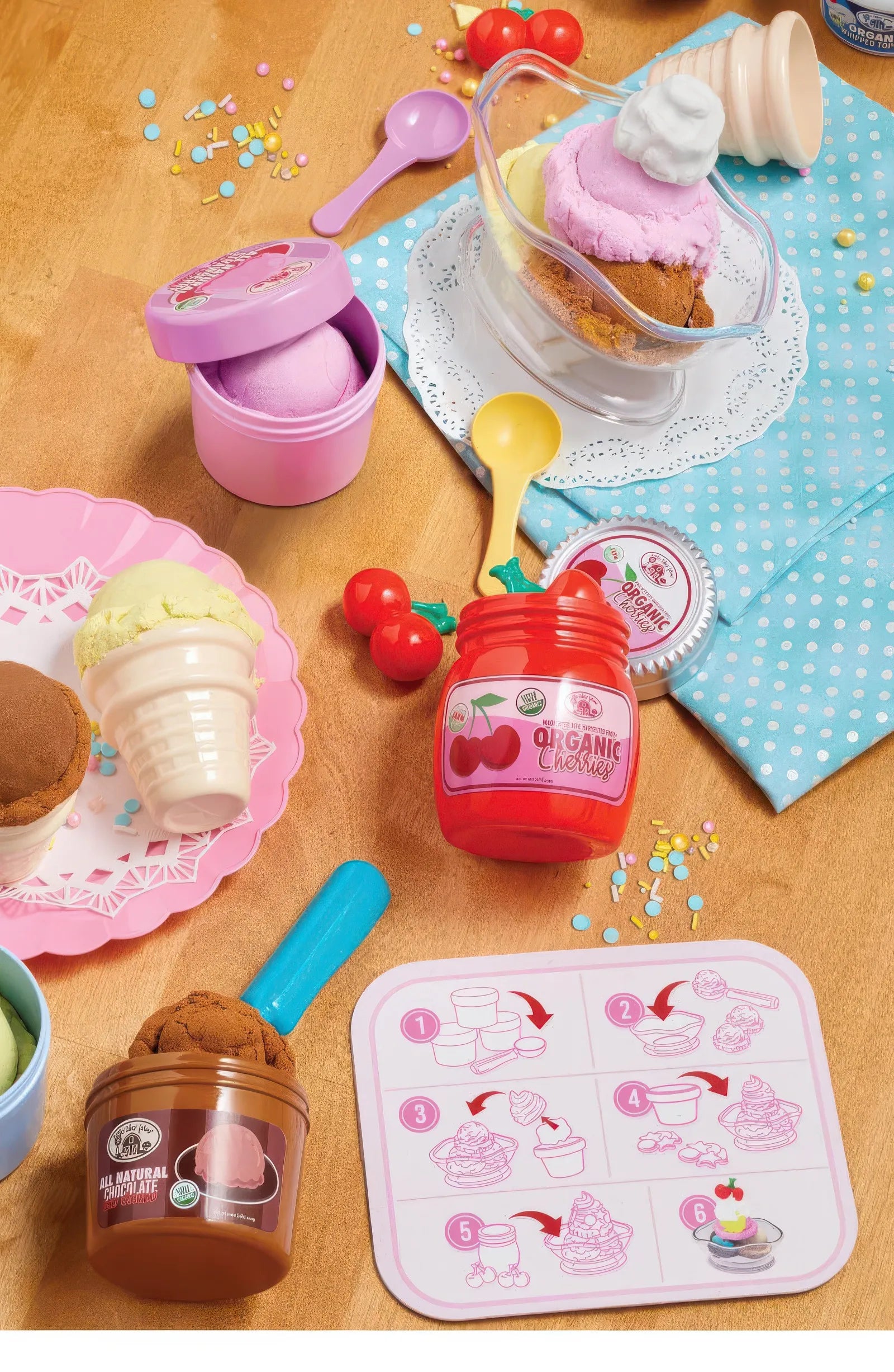 • 17 REALISTIC ACCESSORIES - This ice cream role play set includes 3 flavours of Make-It! Mix ice cream, detailed recipe card, whipped cream mould and container with Make-It! Mix, cherry jar with 3 cherry clusters, chocolate syrup bottle, 2 ice cream cones, ice cream scooper, 2 spoons, and sundae dish.