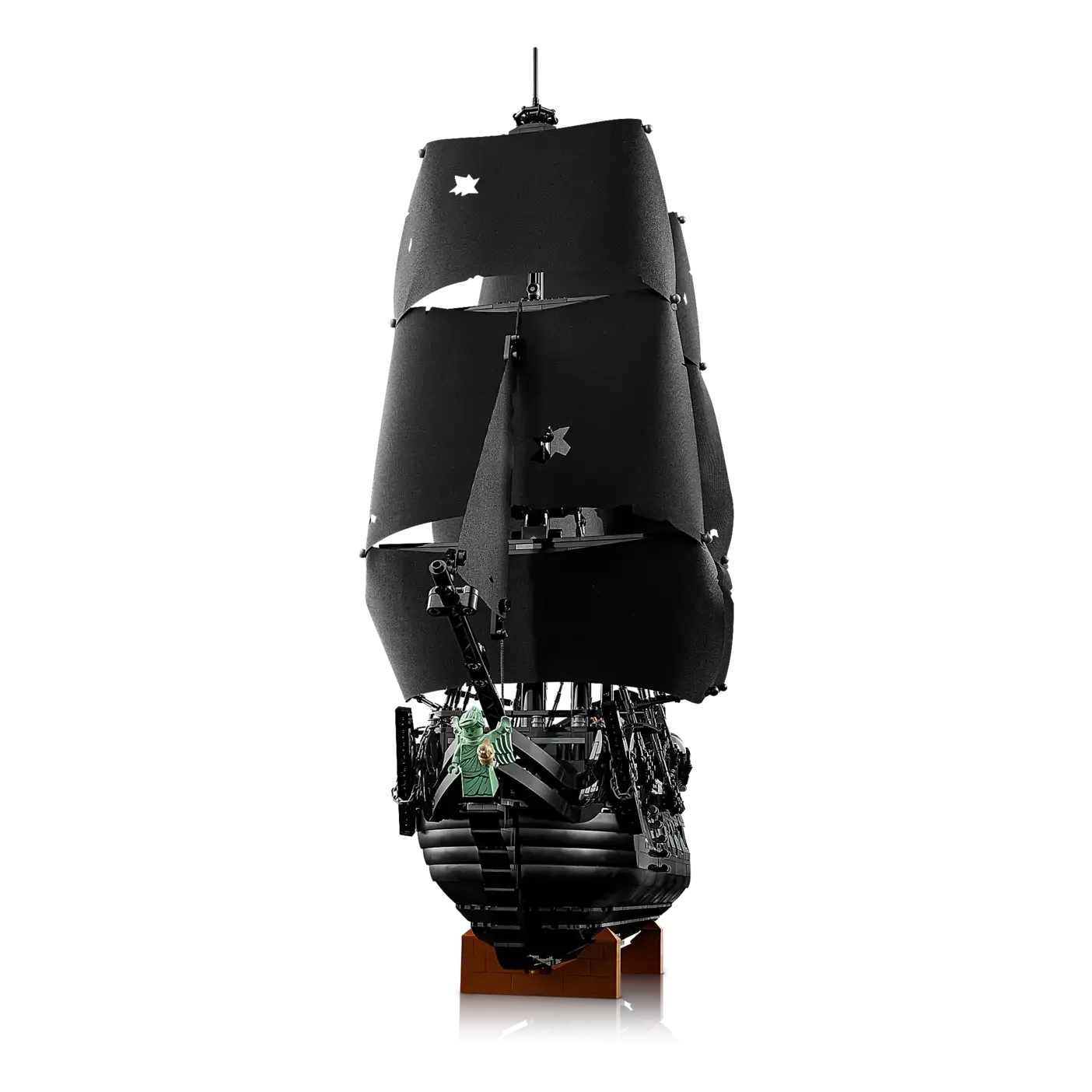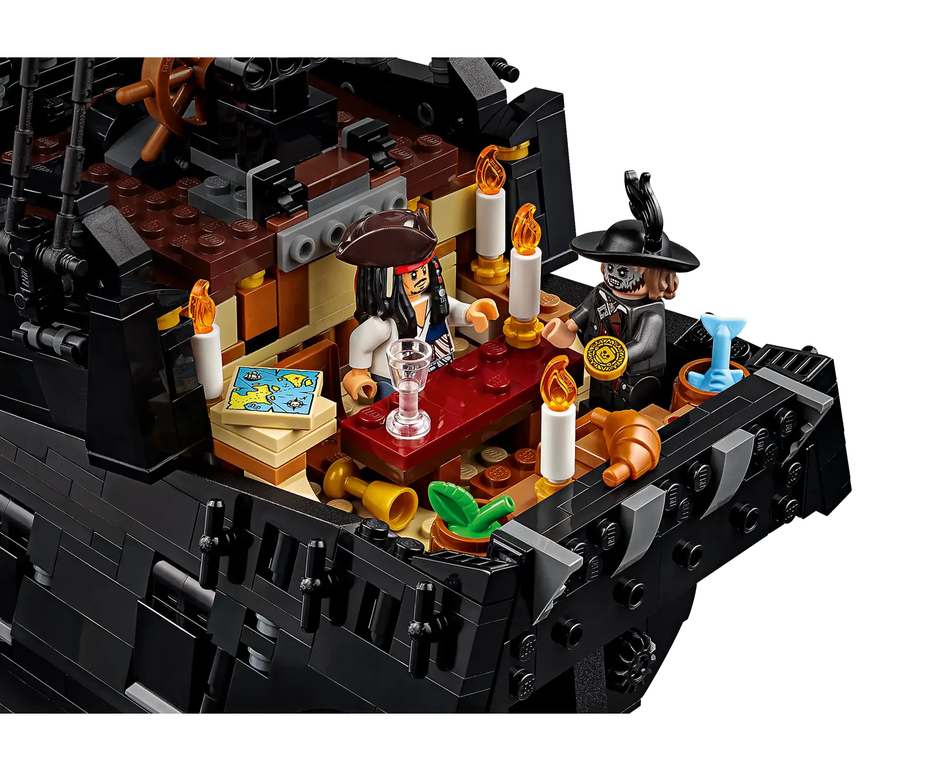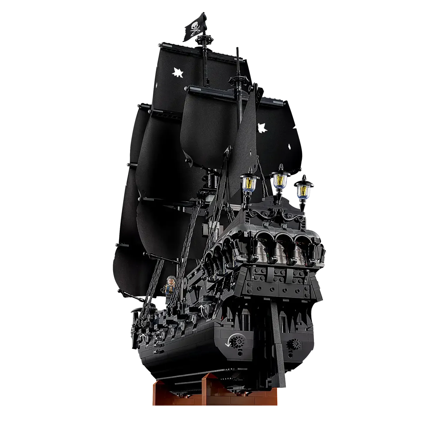 This movie replica model captures the ship in all its glory. Rotate dials to deploy the port or starboard cannons, turn the ship’s wheel to steer the rudder and open the deck to reveal the captain’s quarters with furnishings, candlesticks and an apple. Additional features include a detachable row boat, a figurehead minifigure and a versatile stand for angled display. Alternatively, the hull can be split at the waterline to depict the ship in sailing mode.