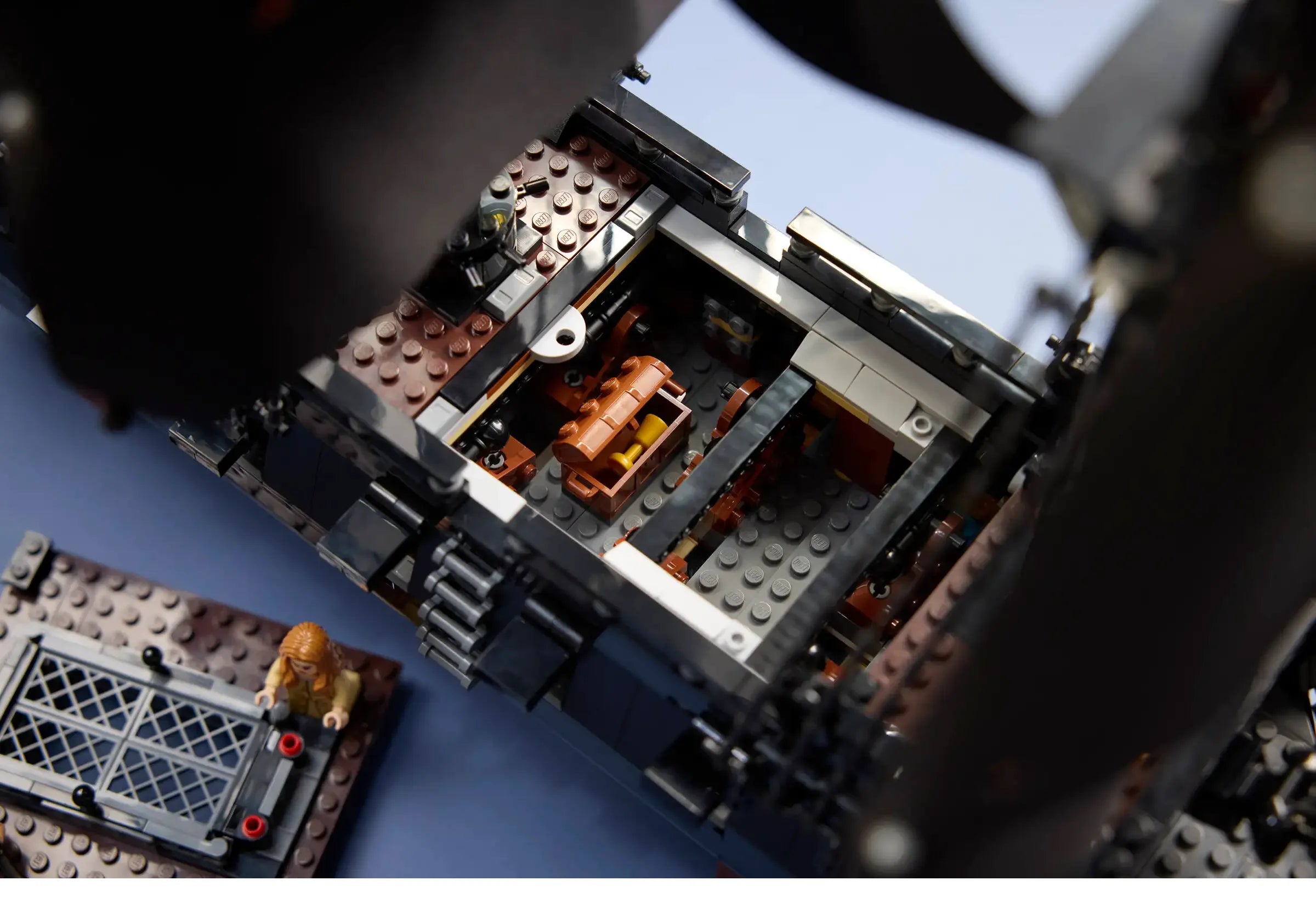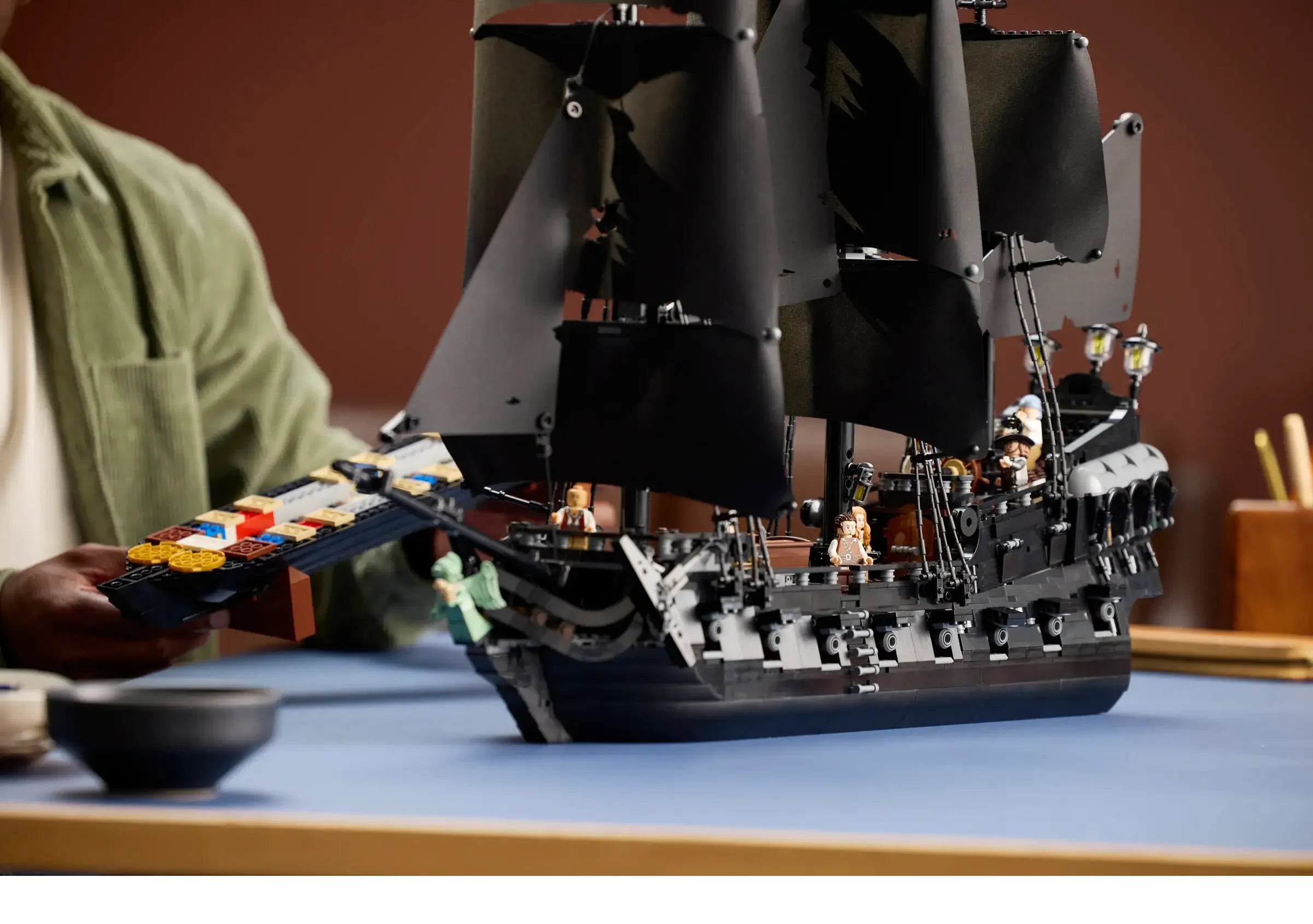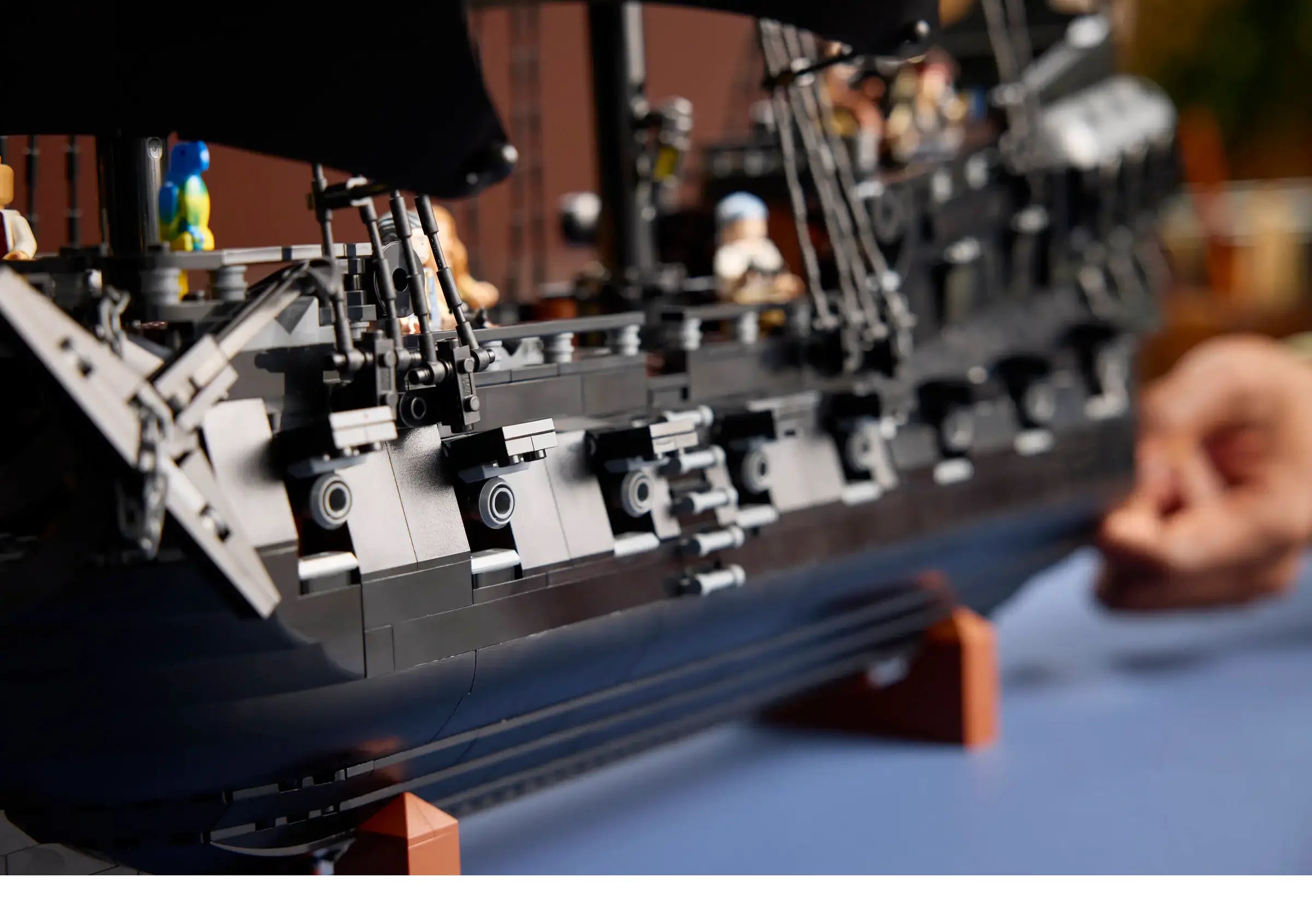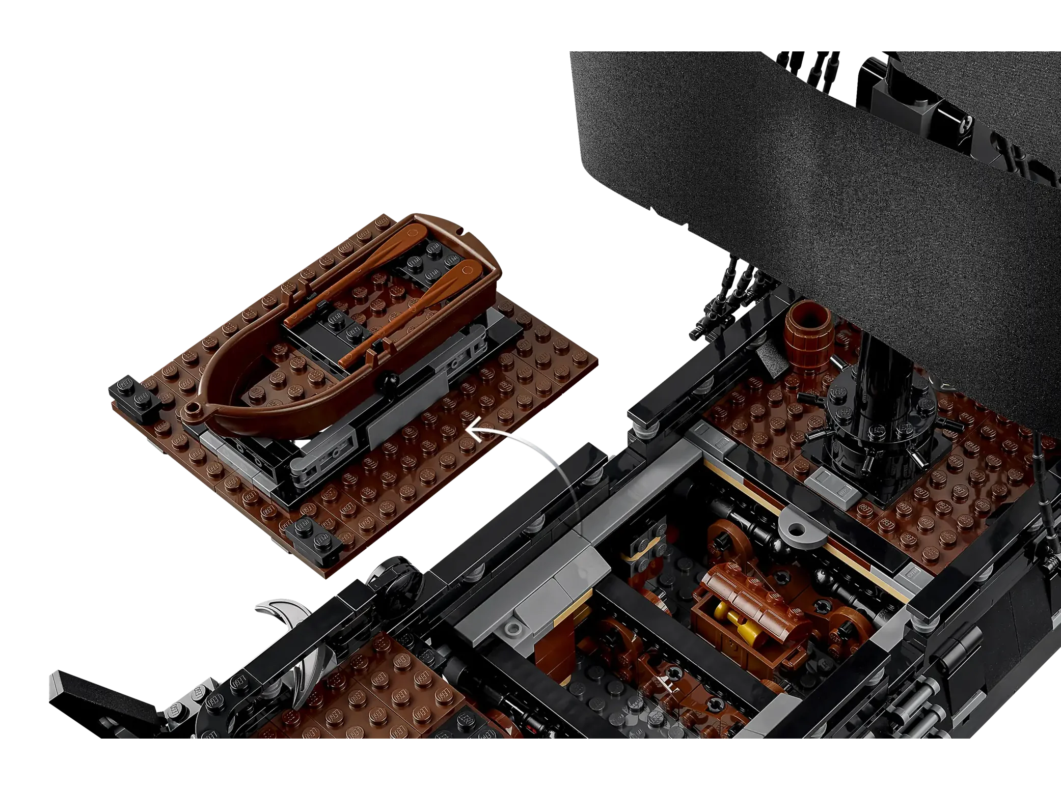 This movie replica model captures the ship in all its glory. Rotate dials to deploy the port or starboard cannons, turn the ship’s wheel to steer the rudder and open the deck to reveal the captain’s quarters with furnishings, candlesticks and an apple. Additional features include a detachable row boat, a figurehead minifigure and a versatile stand for angled display. Alternatively, the hull can be split at the waterline to depict the ship in sailing mode.