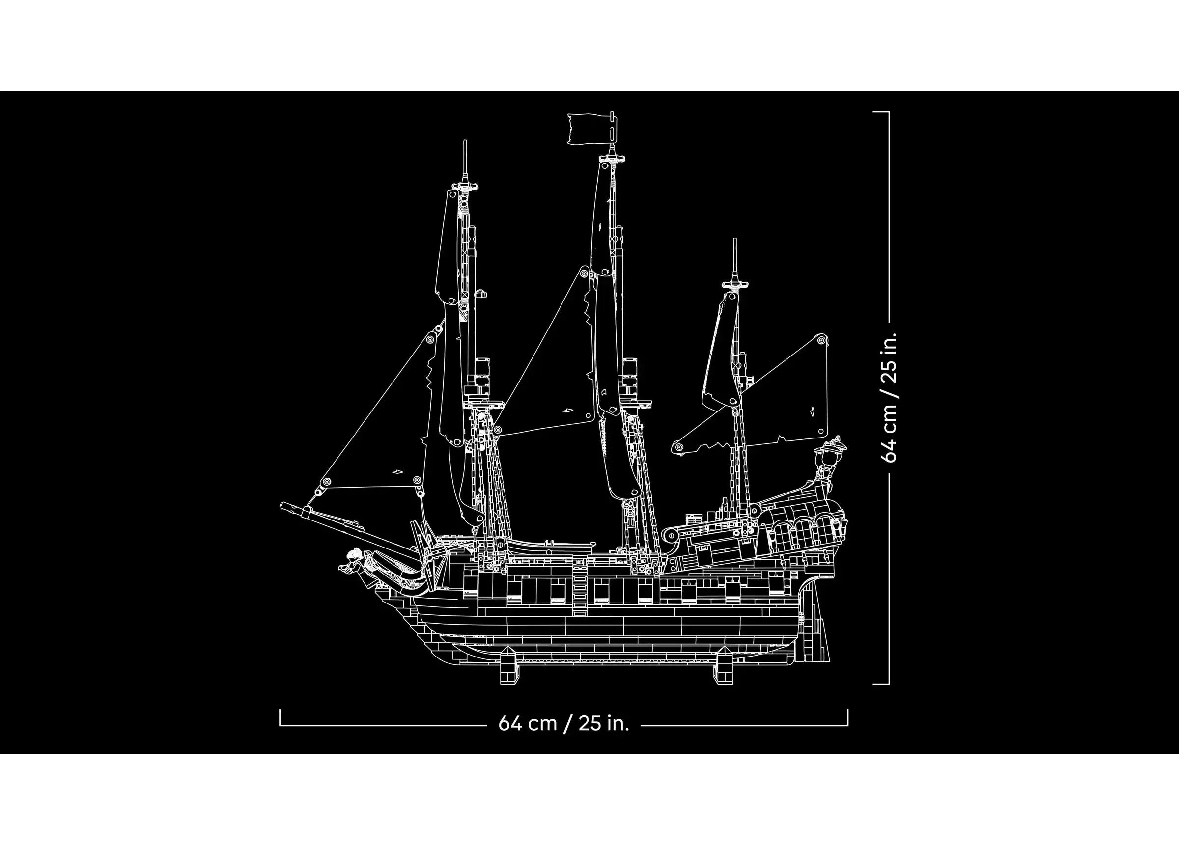 • Dimensions – The model pirate ship in this 2,862-piece building set measures over 25 in. (64 cm) high, 25 in. (64 cm) long and 9 in. (23 cm) wide