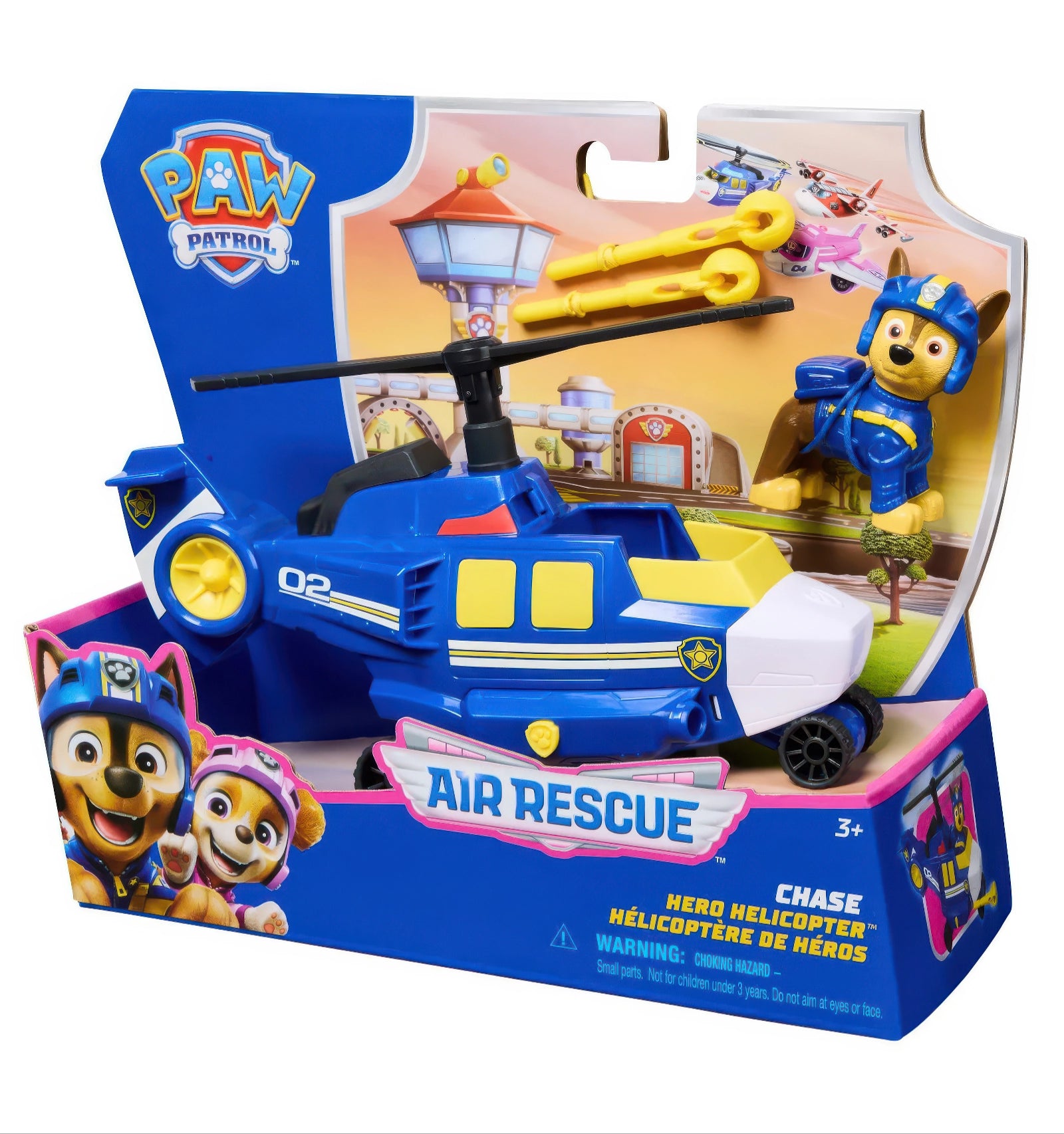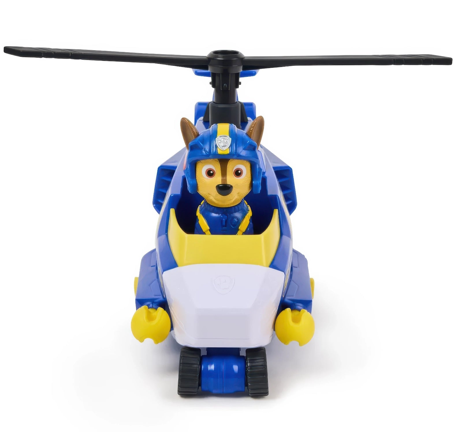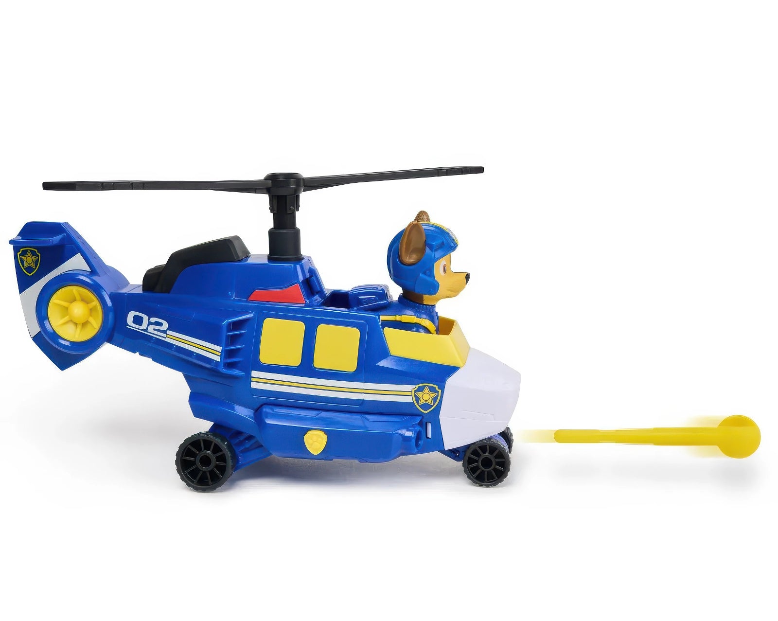 Fly into action with Air Rescue Chase and his police themed toy helicopter! When it's time for an action-packed rescue, lock Chase's feet into position in the cockpit and twirl the propellers before taking off on your mission! Load the cannon with one of two rescue projectiles included, then press the PAW badge on the helicopter to launch them and save the day! Chase stands over 2-inches tall and is geared up in his blue Air Rescue flight jacket & helmet!
