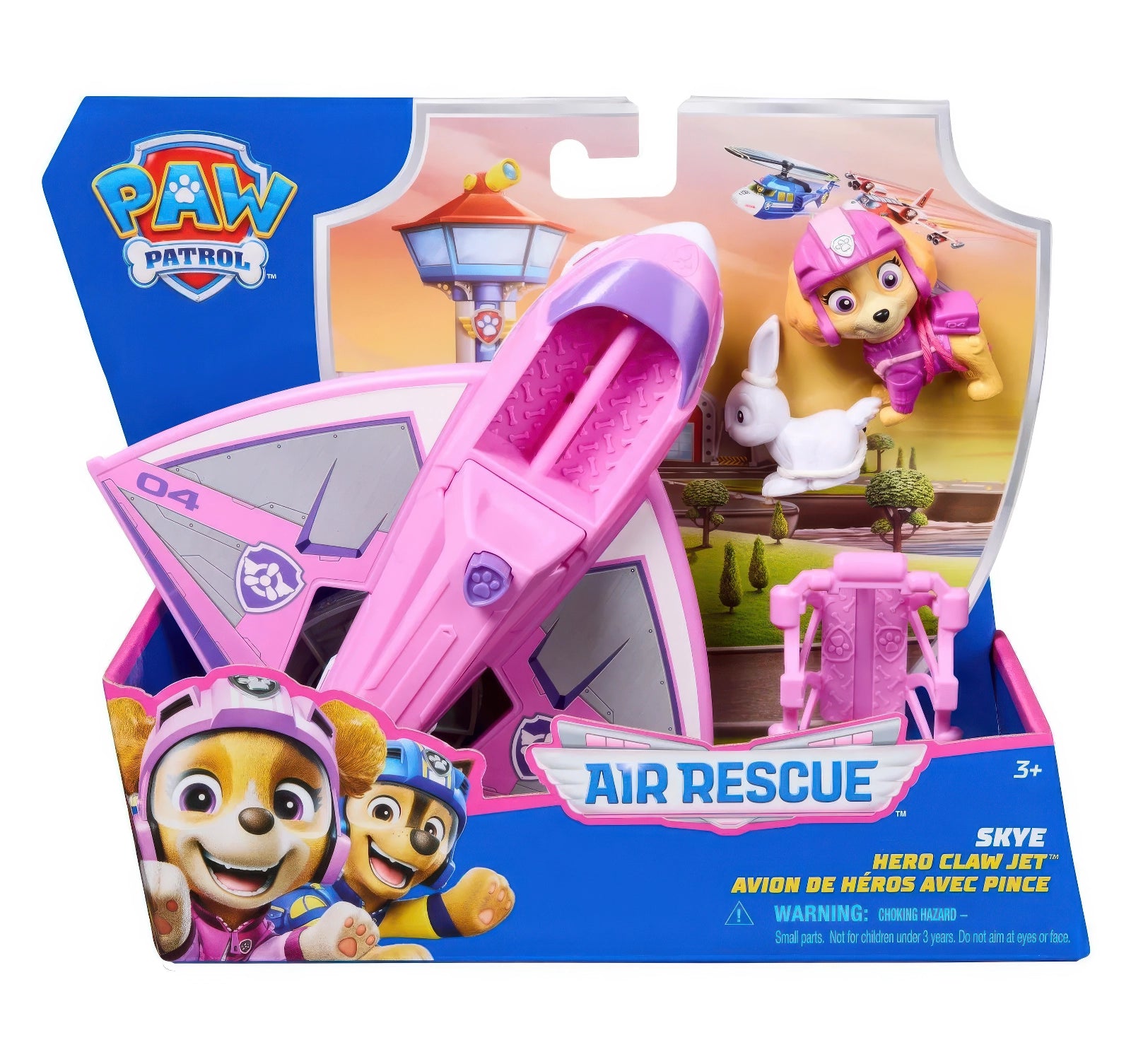 Fly into action with Air Rescue Skye and her fire rescue Hero Claw Toy Jet! When it's time for an action-packed rescue, lock Skye's feet into position in the cockpit before taking off on your mission! Save your bunny toy figure by pushing a button on the plane to extend the claw, then scoop bunny up with the rescue basket & fly him to safety!