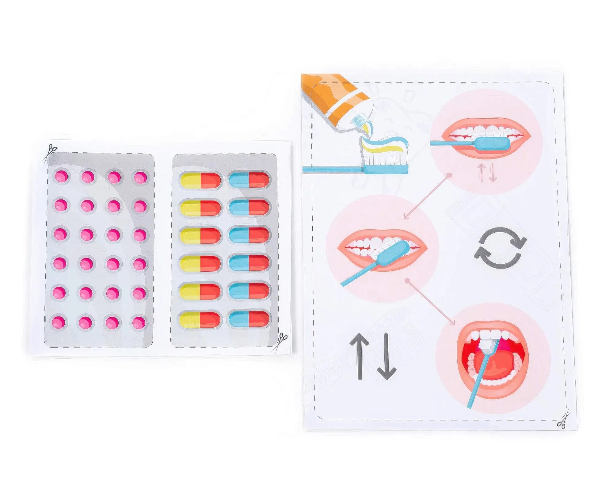 • 🧰 19-piece set – includes toy dental tools, mirror, syringe, thermometer, glasses, and more