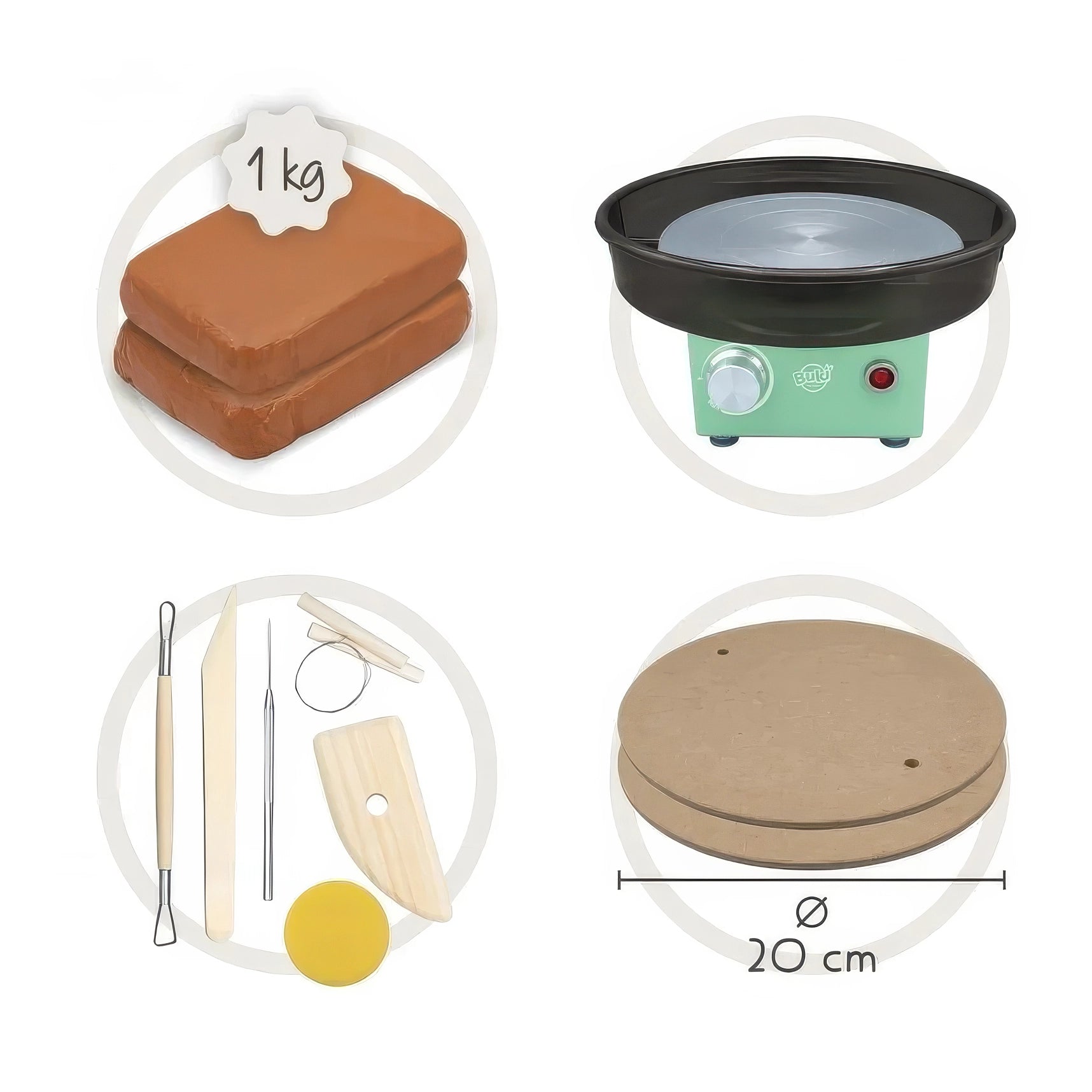 The 20 cm diameter metal wheel head can be used to make creations of all sizes. Two wheel bats are supplied so you can move your creations away to dry, freeing the wheel for new creations.