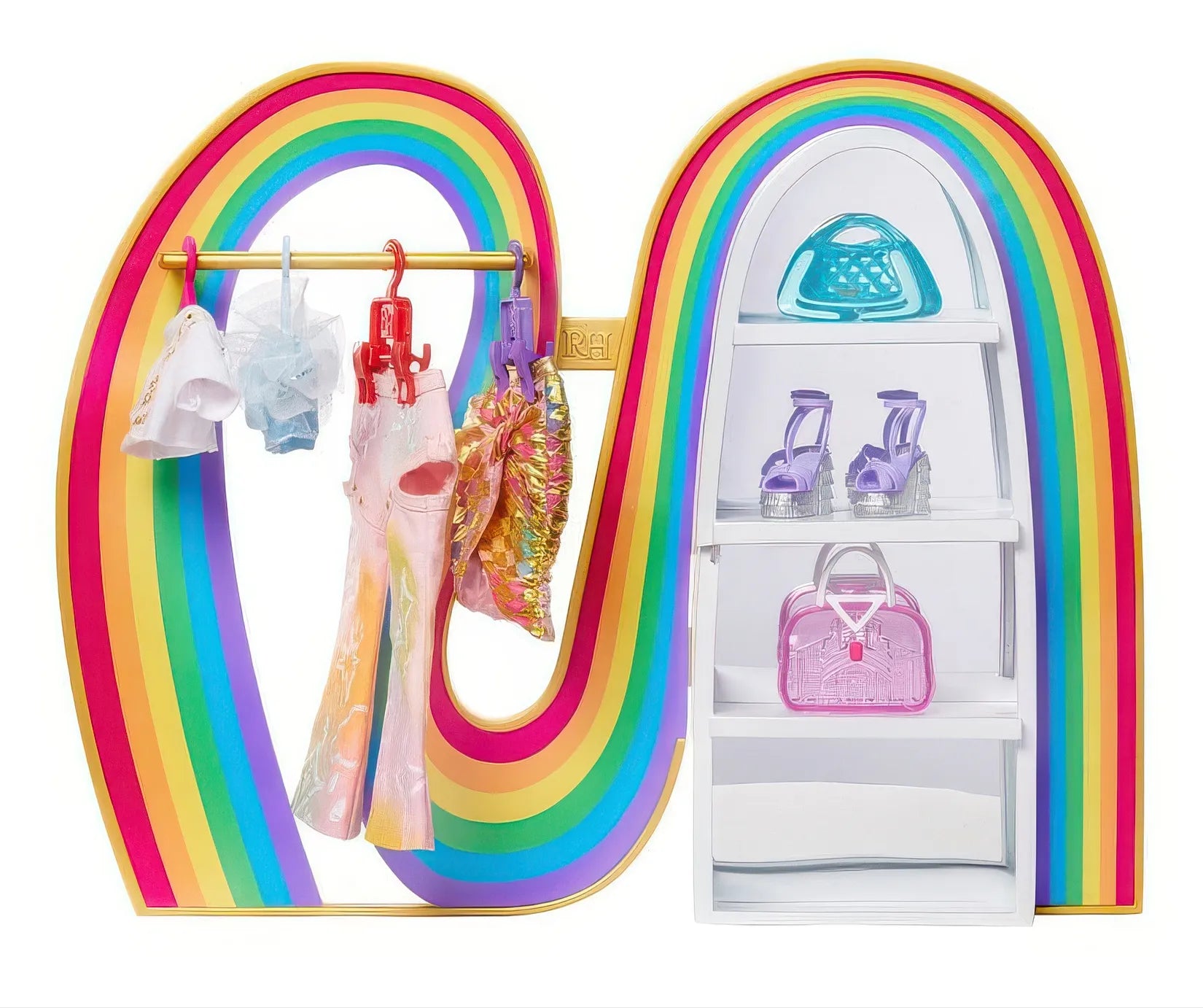 • RAINBOW CLOSET PLAYSET. Comes with the must-have exclusive doll, clothes rack, hangers, clothes, tiered shelves, shoes and purses.