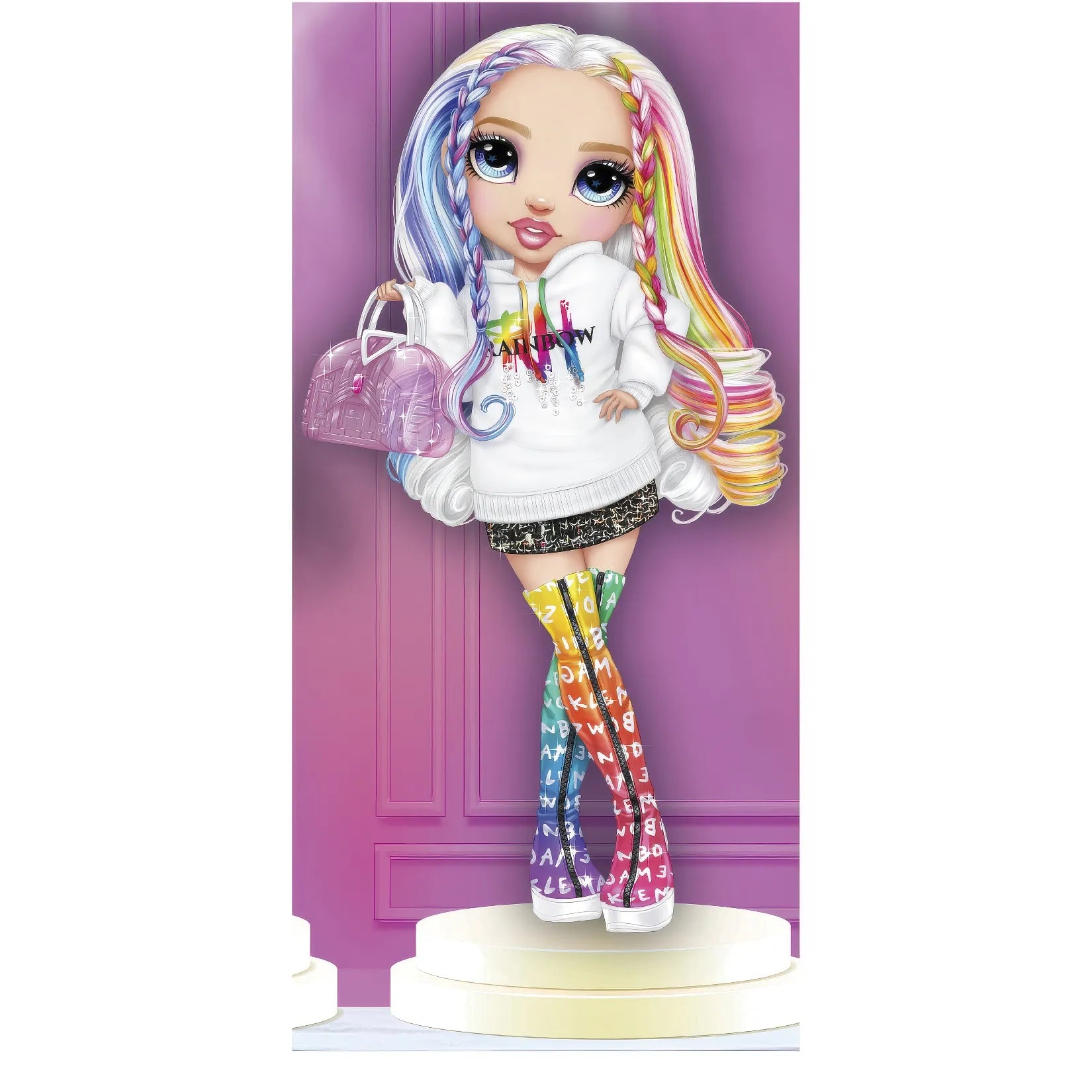 Amaya Raine Fashion Doll – with long rainbow-coloured hair, styled with braids and soft waves. She wears a white hoodie with a “RAINBOW” print, mini skirt, and bold rainbow gradient knee-high boots with printed text.