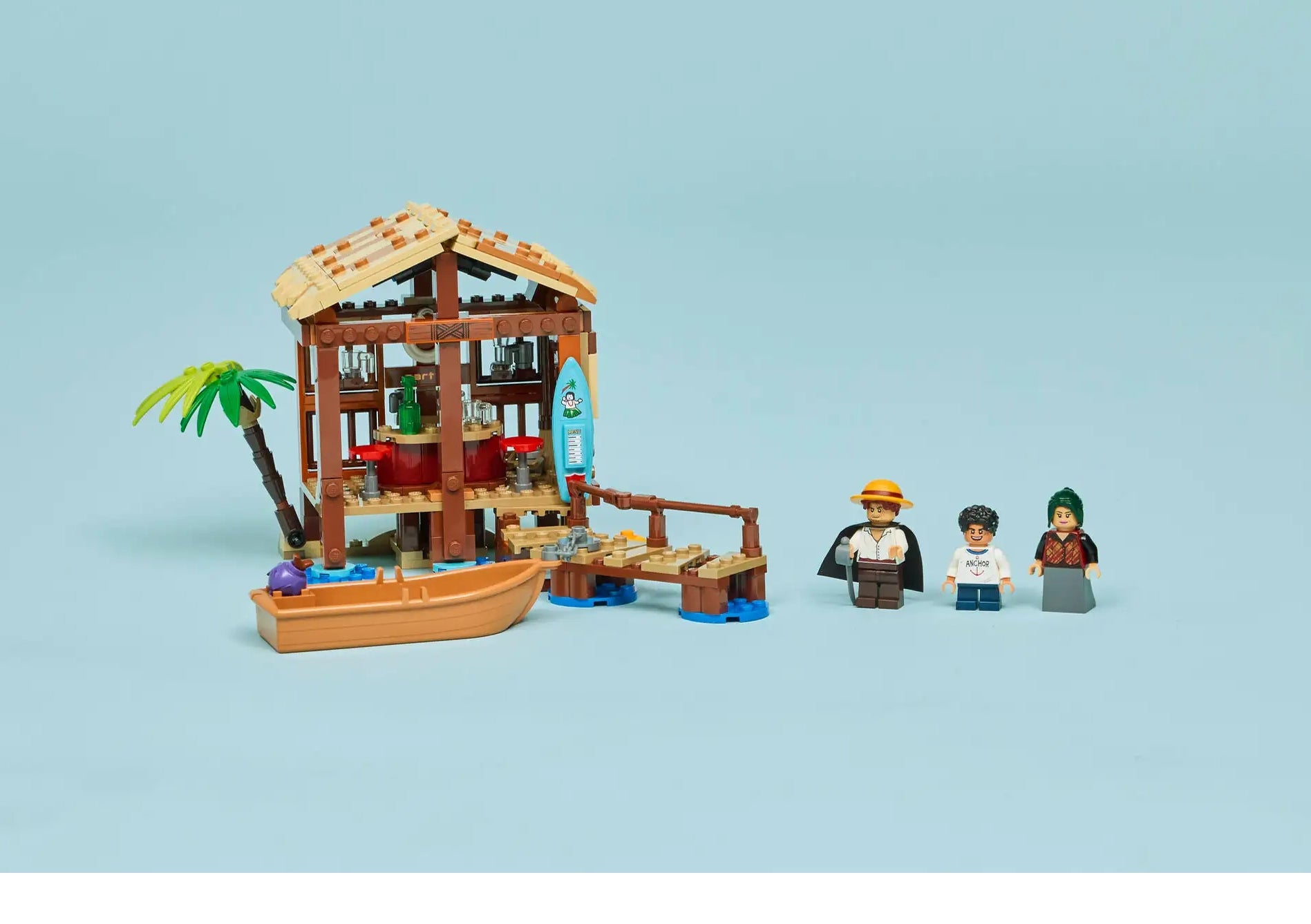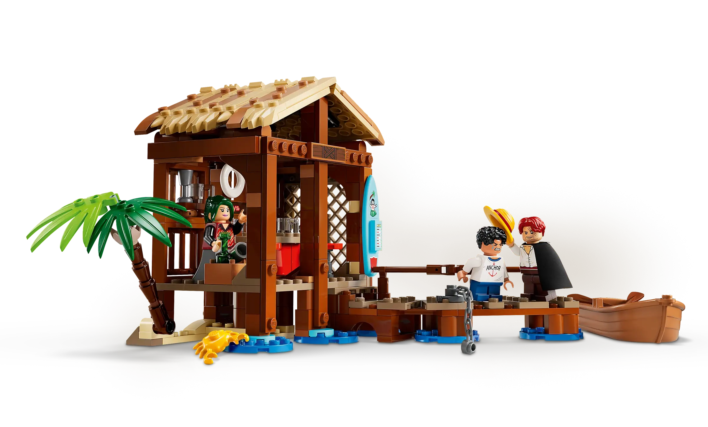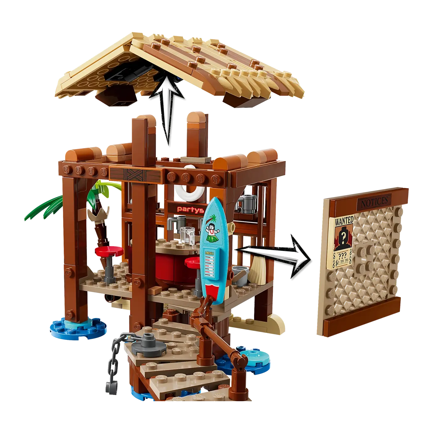 Kids can remove the roof of the beachside store to access its fun-filled interior. Inside, they’ll find accessories for running the store and entertaining customers. There’s a ‘Wanted’ poster to attach to the wall, and space for additional ‘Wanted’ posters available in other LEGO® ONE PIECE models (sold separately). Outside, there’s a pirate boat toy attached to the jetty by a chain.