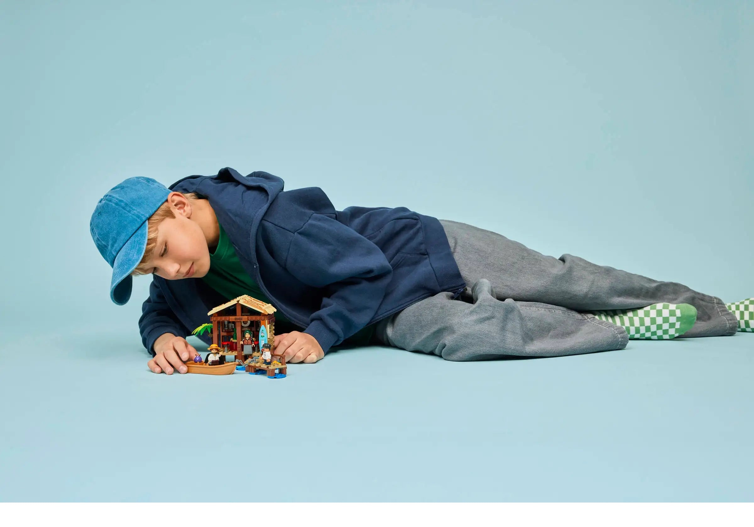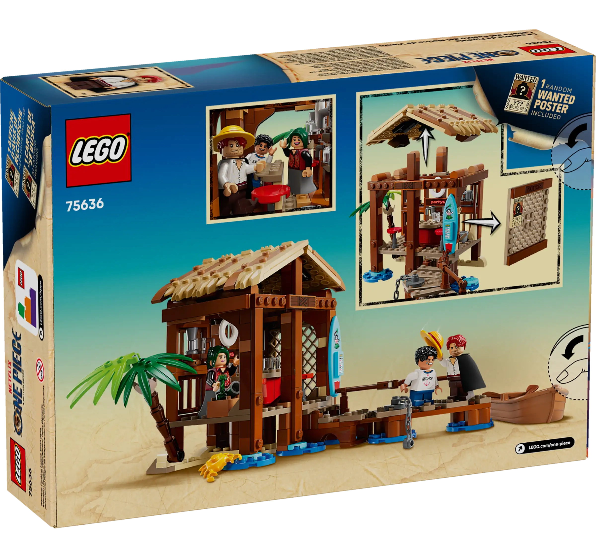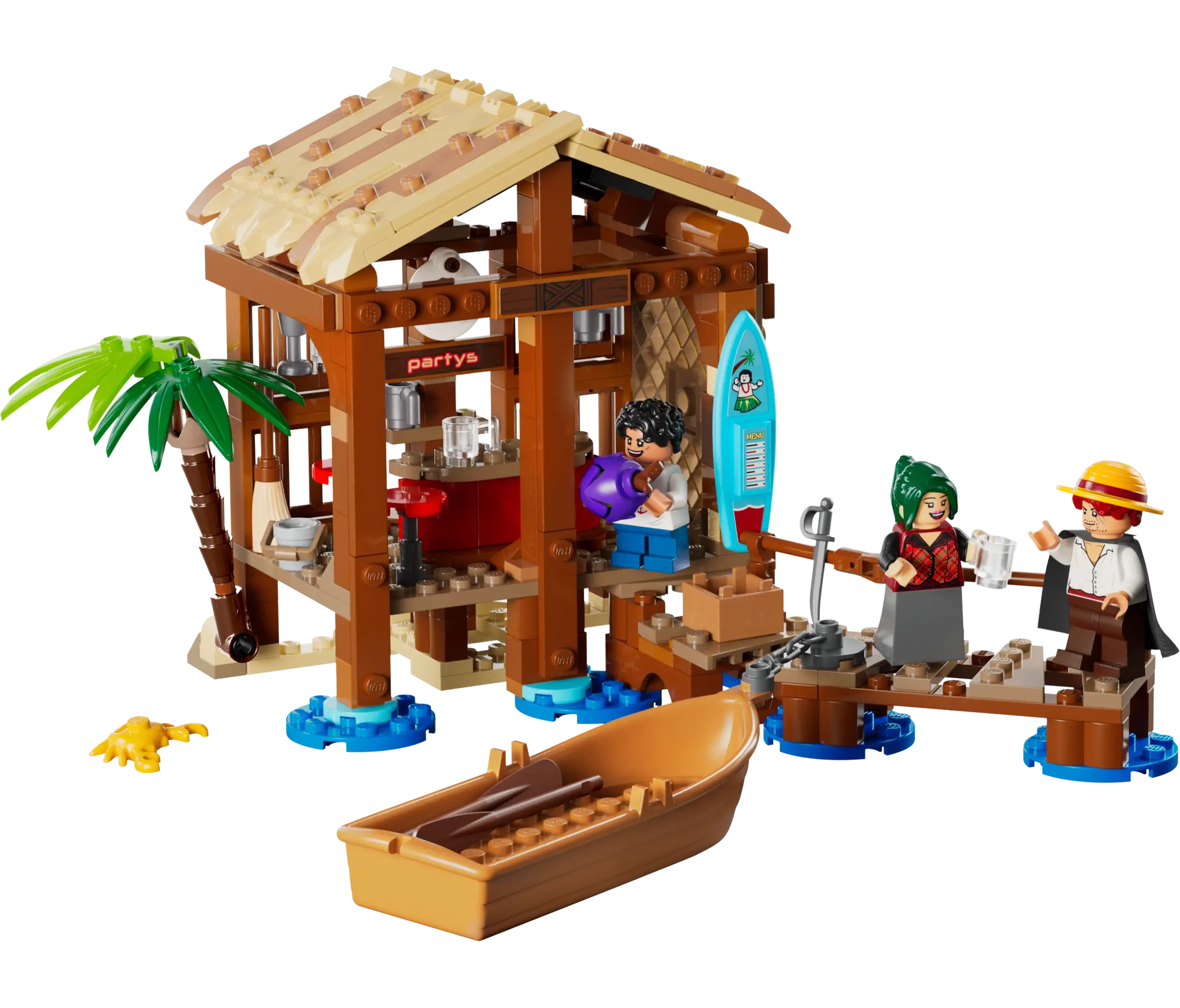 Kids can remove the roof of the beachside store to access its fun-filled interior. Inside, they’ll find accessories for running the store and entertaining customers. There’s a ‘Wanted’ poster to attach to the wall, and space for additional ‘Wanted’ posters available in other LEGO® ONE PIECE models (sold separately). Outside, there’s a pirate boat toy attached to the jetty by a chain.