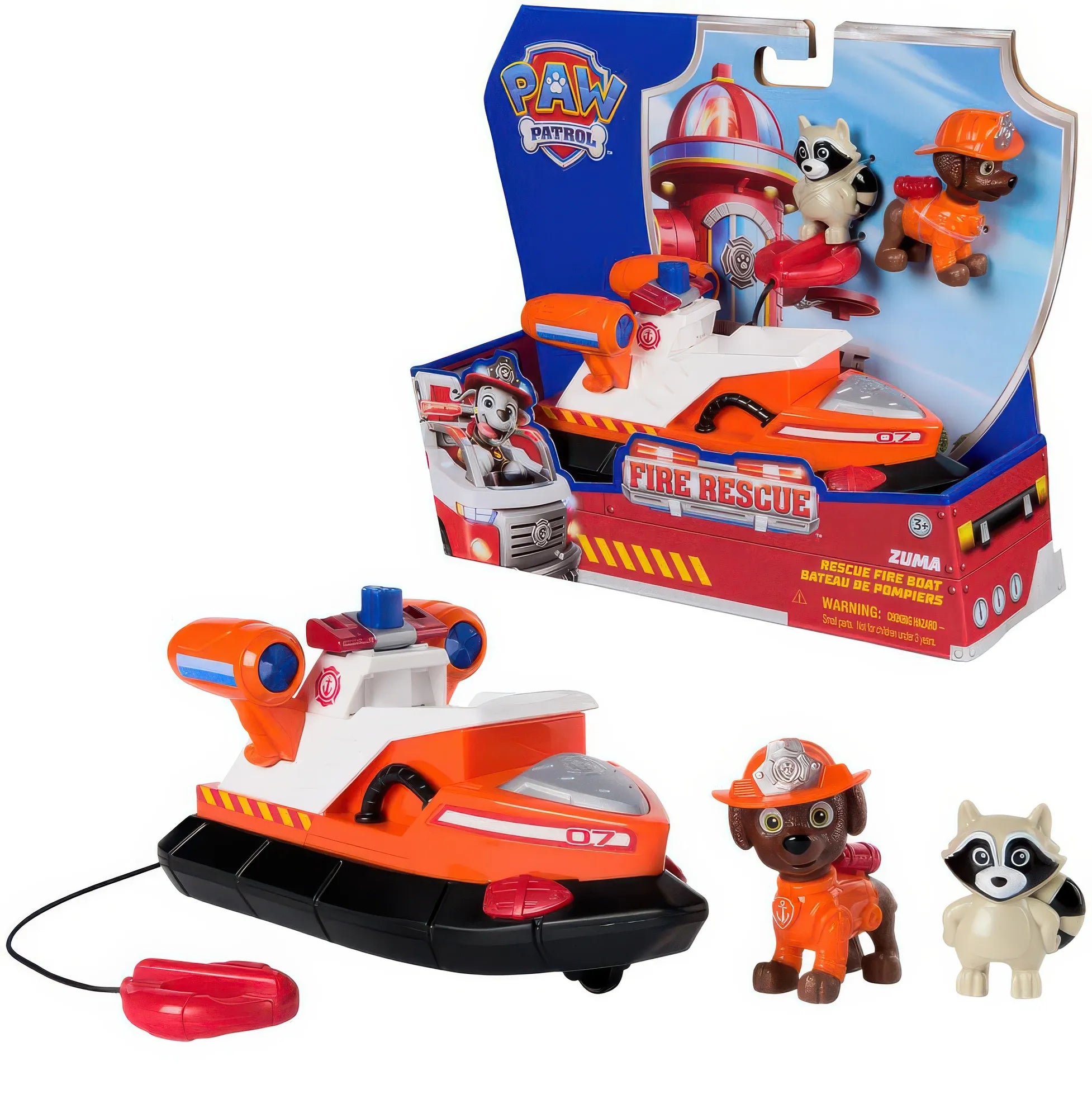 • Contents: 1x PAW Patrol Fire Rescue Fire Boat Vehicle; 1x Zuma Figure; 1x Raccoon Figure