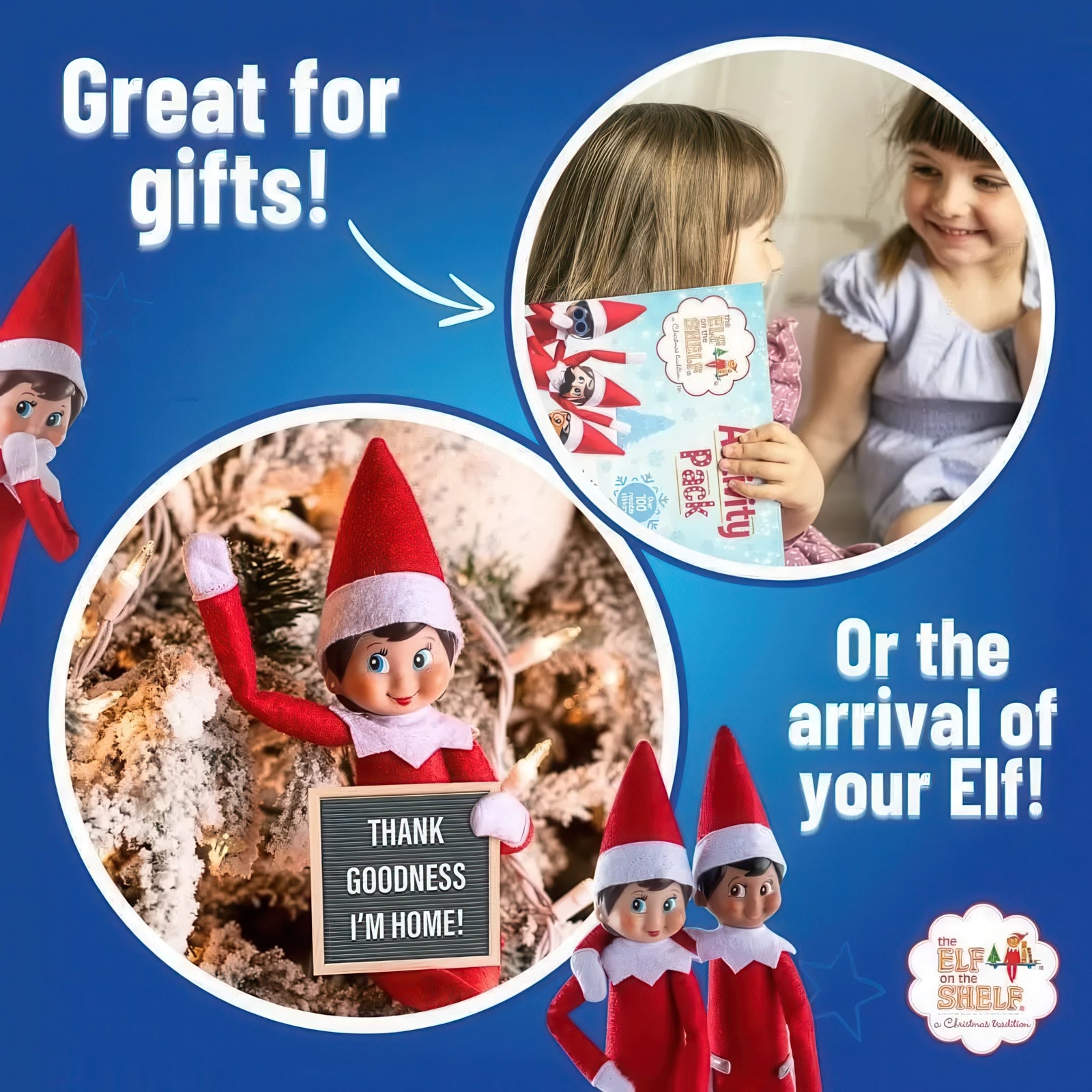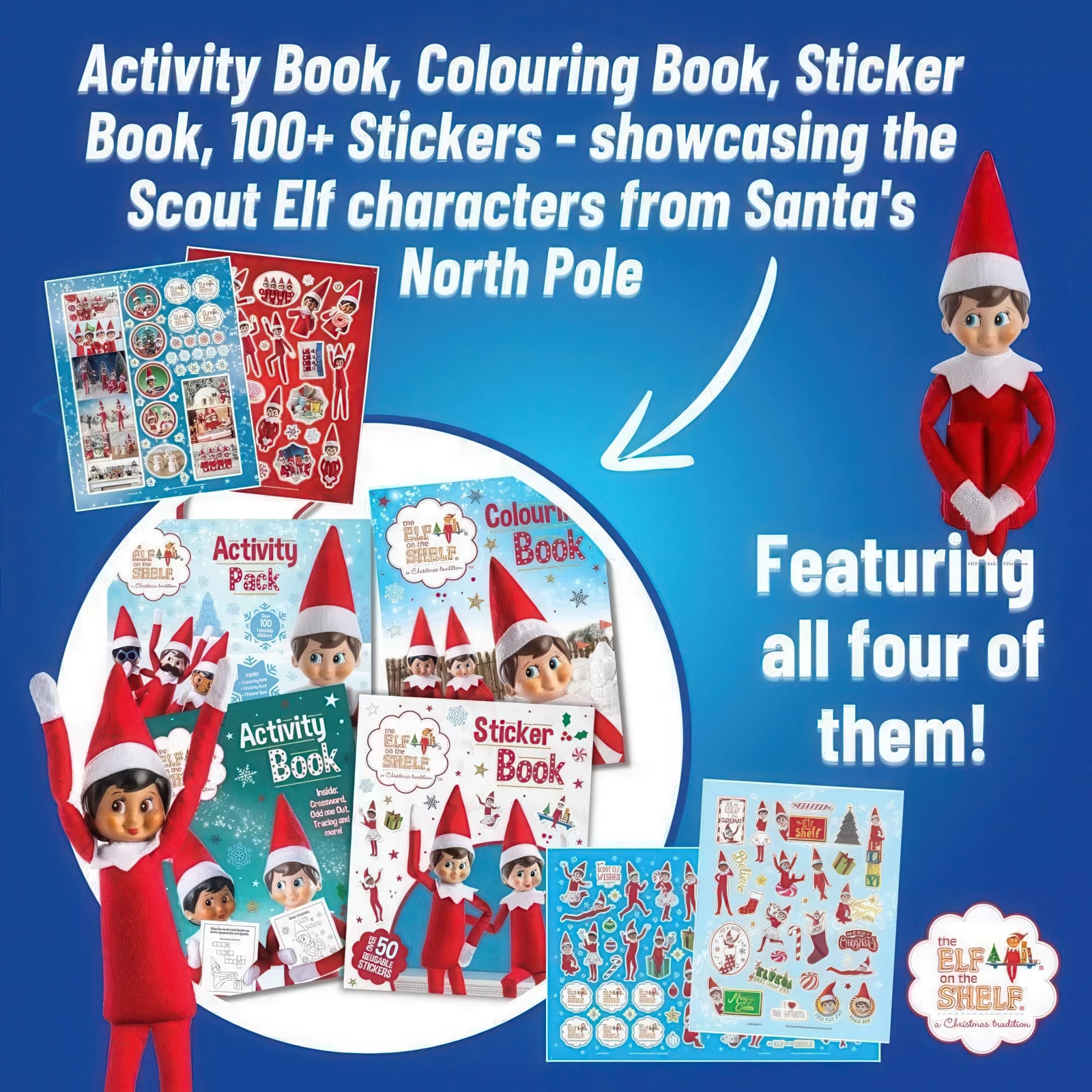 The Elf on the Shelf Activity Pack contains a Sticker Book with 12 pages of fun pictures to colour and a spread of full colour reusable stickers. It also includes a Colouring Book with 16 pages of great pictures to colour, an Activity Book with 16 pages of fantastic activities, and 3 sheets of full colour reusable stickers.