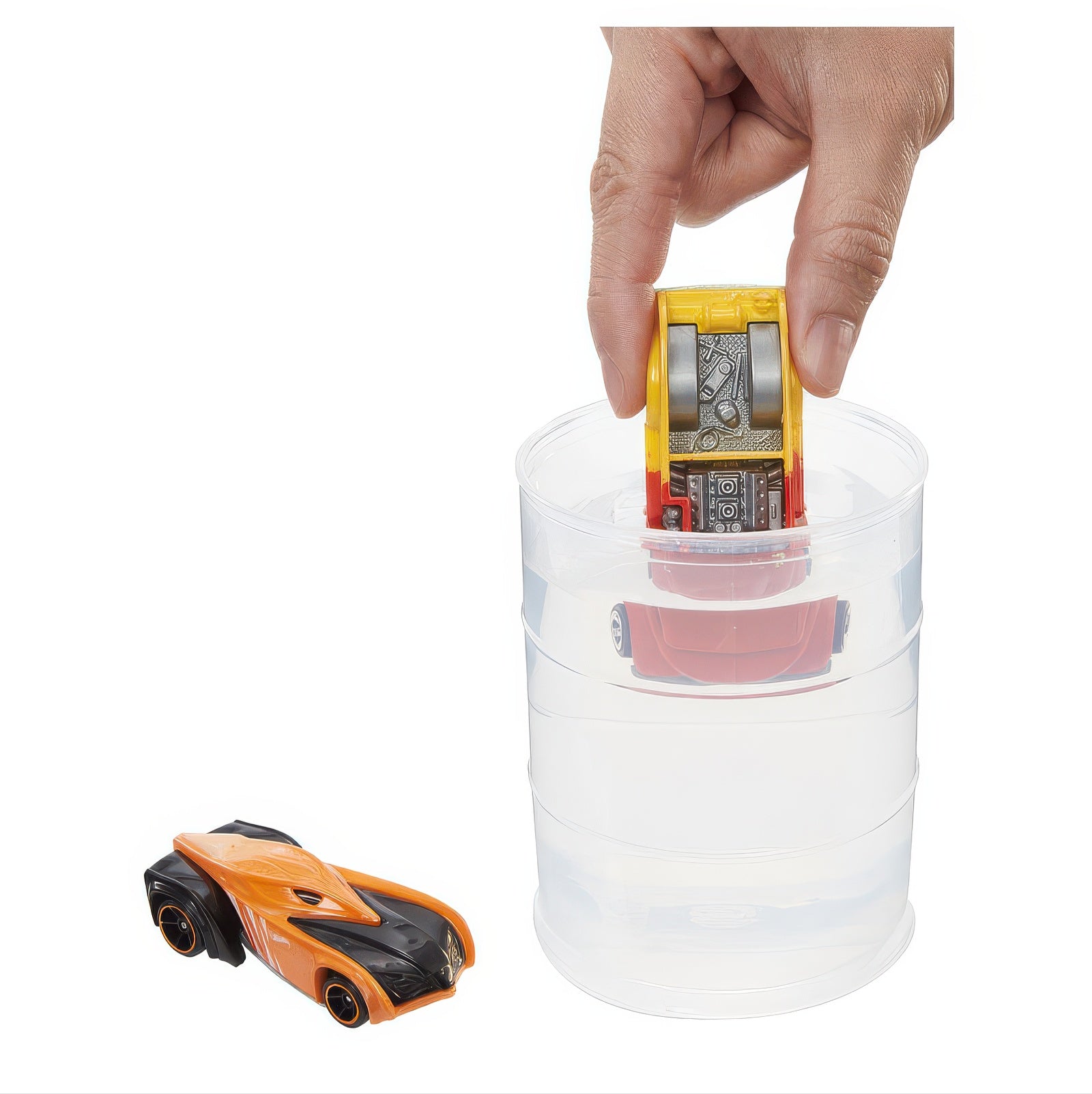 • Because each car is covered in a colour Reveal coating, the initial reveal is filled with fun suspense! Use the reusable barrel packaging as a dunk tank, fill it with water, and swirl the car in it. Watch as the water changes colour and a new deco is revealed on each vehicle!