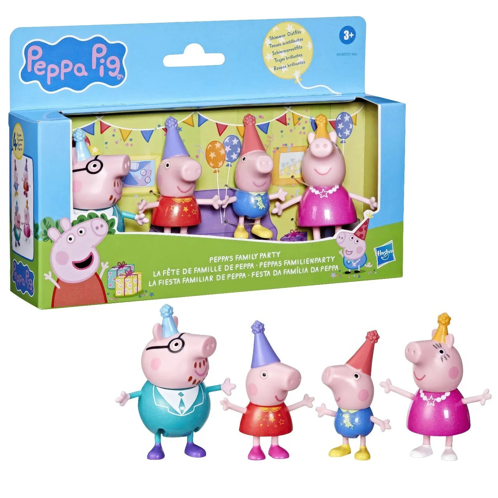 • ADVENTURES WITH PEPPA PIG AND FAMILY: Act out fun everyday adventures with Peppa Pig, Mummy Pig, Daddy Pig, and little brother George Pig figures. PARTY OF 4: This set of figures includes all 4 family members in their iconic outfits, tressed and ready for adventure.
