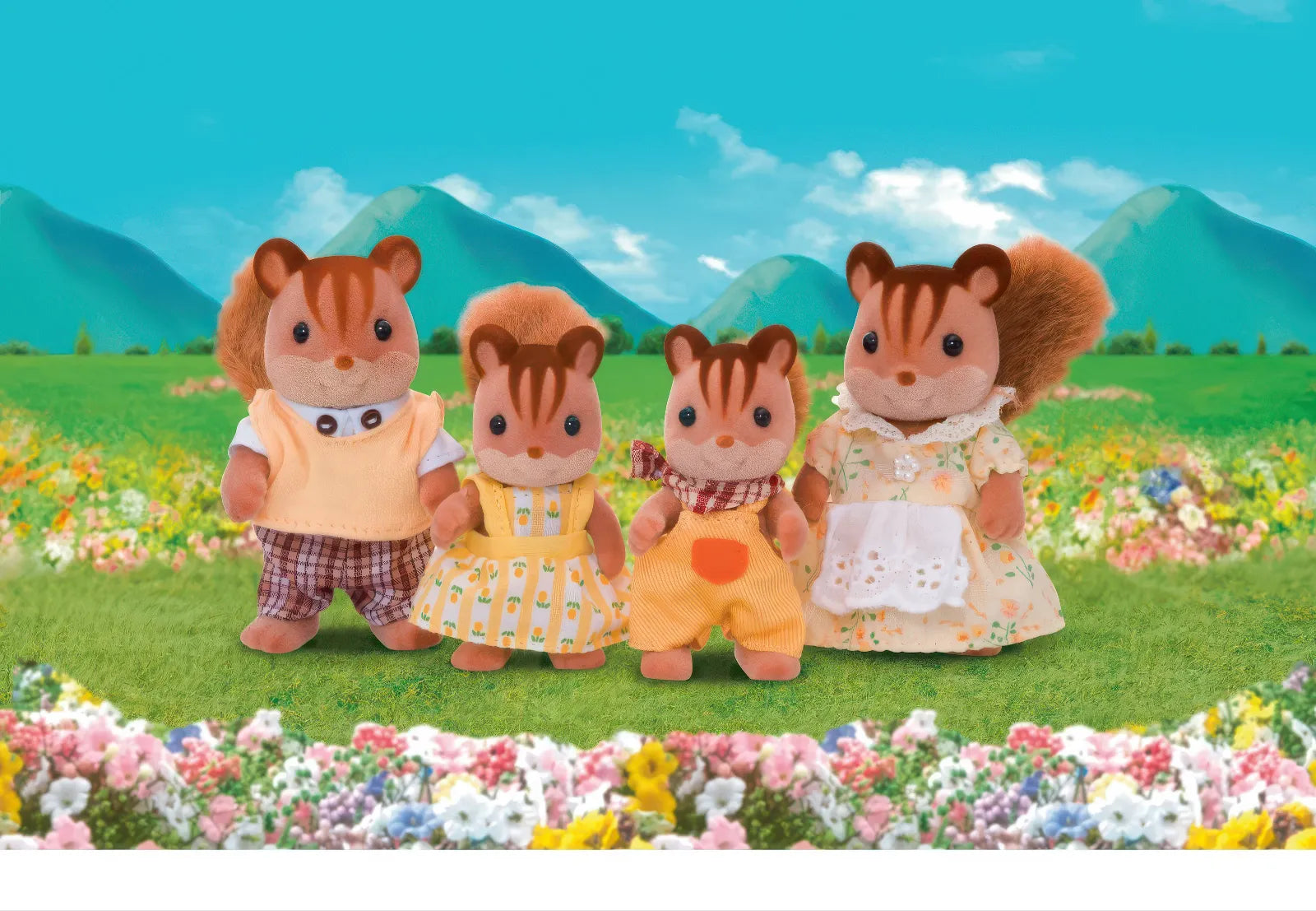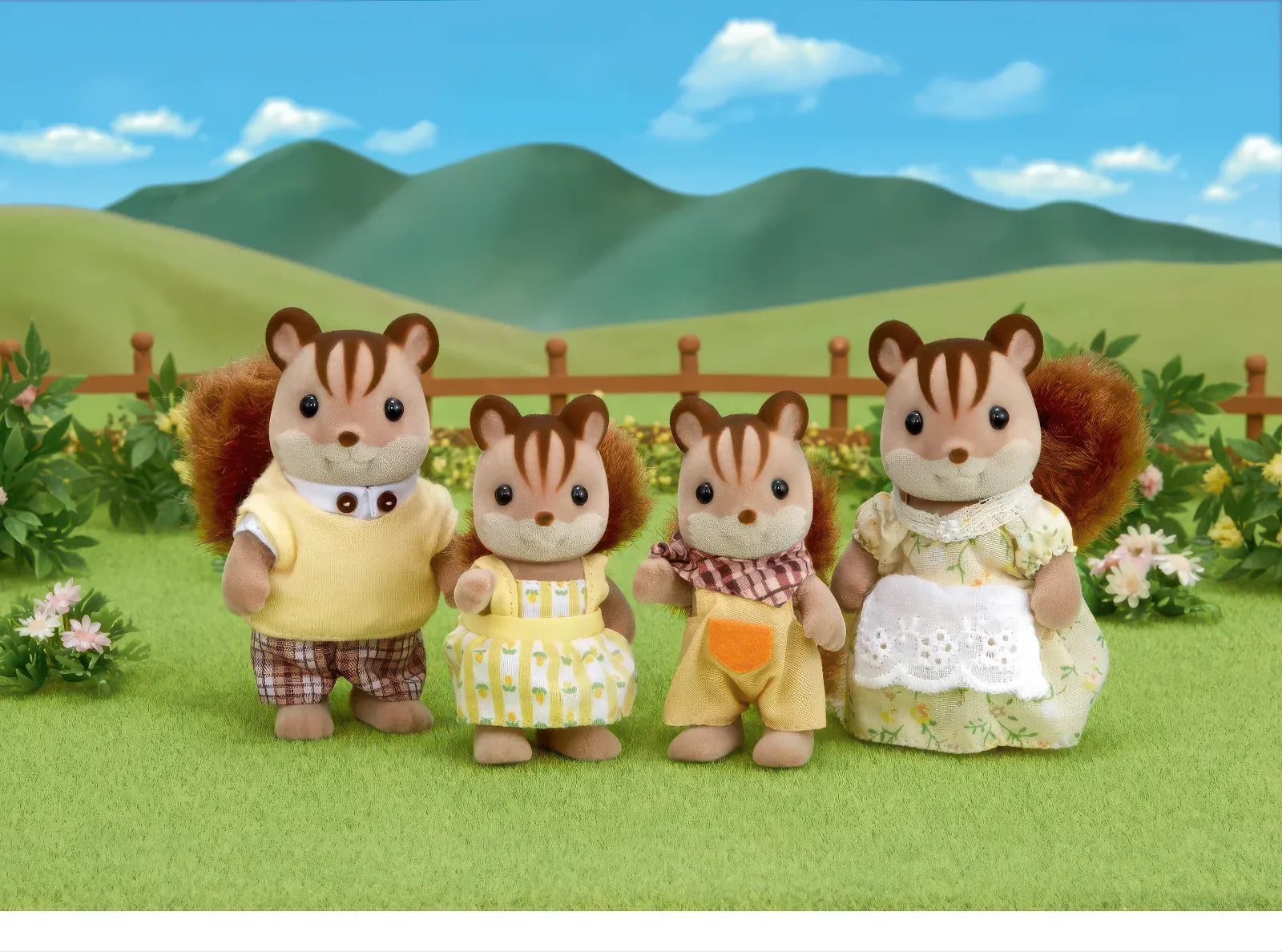 The Walnut Squirrel Family from Sylvanian Families has four members: Father, Mother, Brother and Sister. Dressed in removable fabric clothing.
